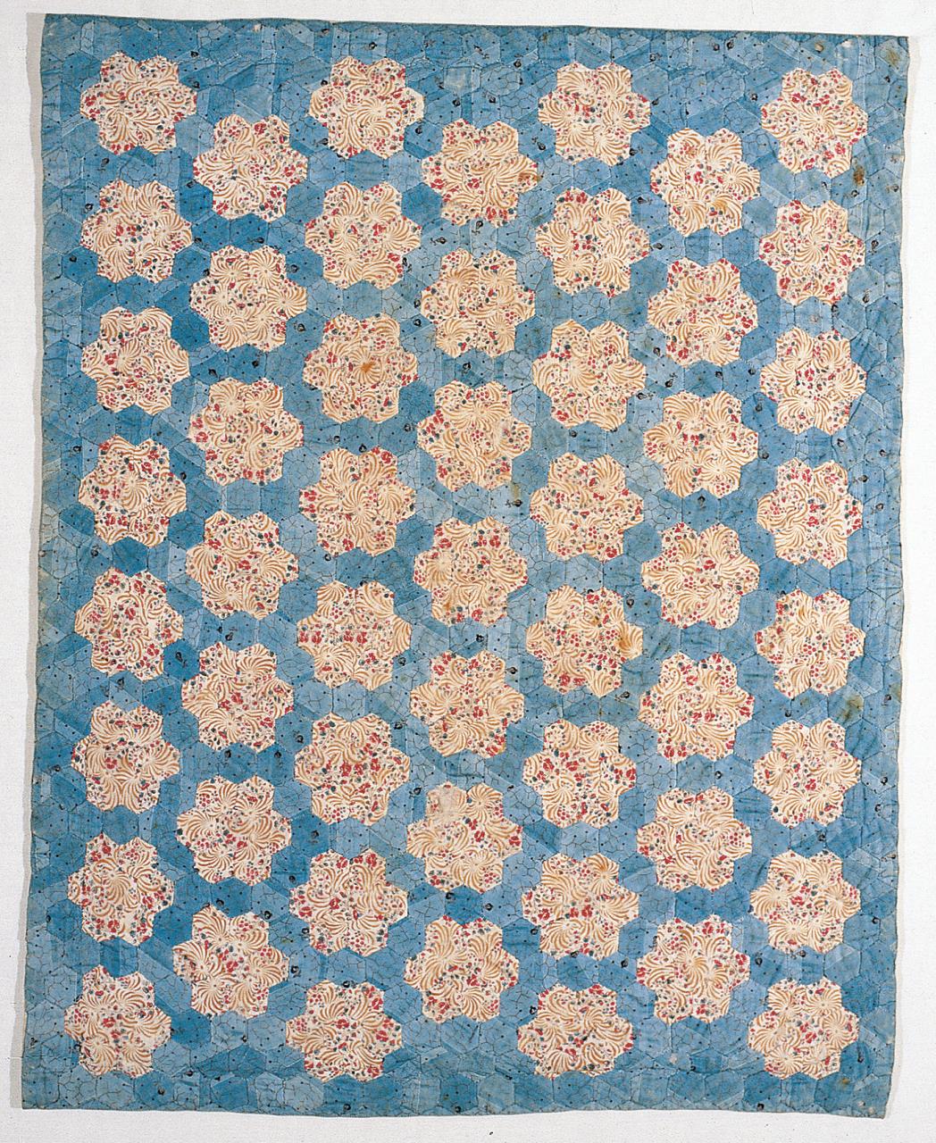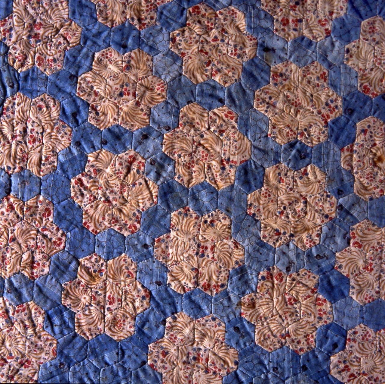 - The cover is made from roller-printed dress cottons, using tiny hexagons to create the grandmother's flower garden pattern.The cover is interlined with white muslin, and backed with pieced white cotton. Only the edges are quilted, and here the hexagons are outlined in a single line of stitching.