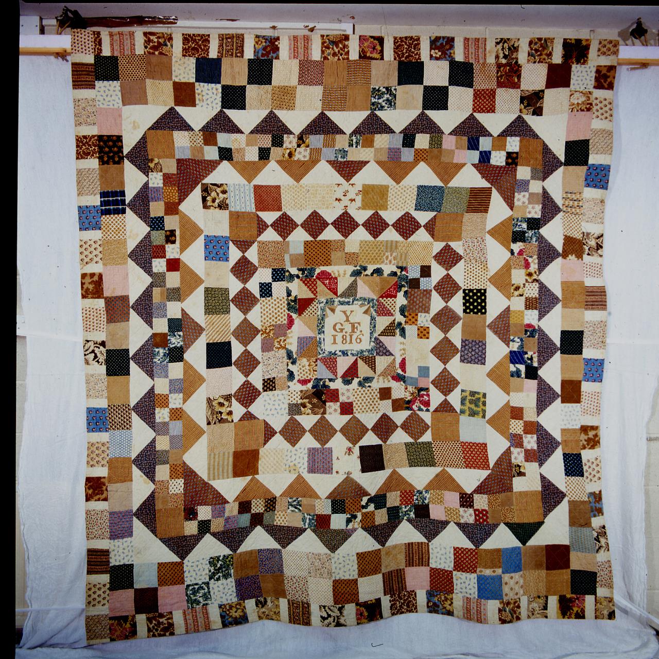 - The bedcover has been made from block- and roller- printed dress and furnishing cottons; the earliest date from about 1805. The small central panel of white cotton is enclosed by eleven patchwork borders made up of squares and triangles. The bedcover is backed with unbleached cotton with a thin wadding, and the central wave and wineglass quilting patterns are surrounded by a deep border of square diamonds.