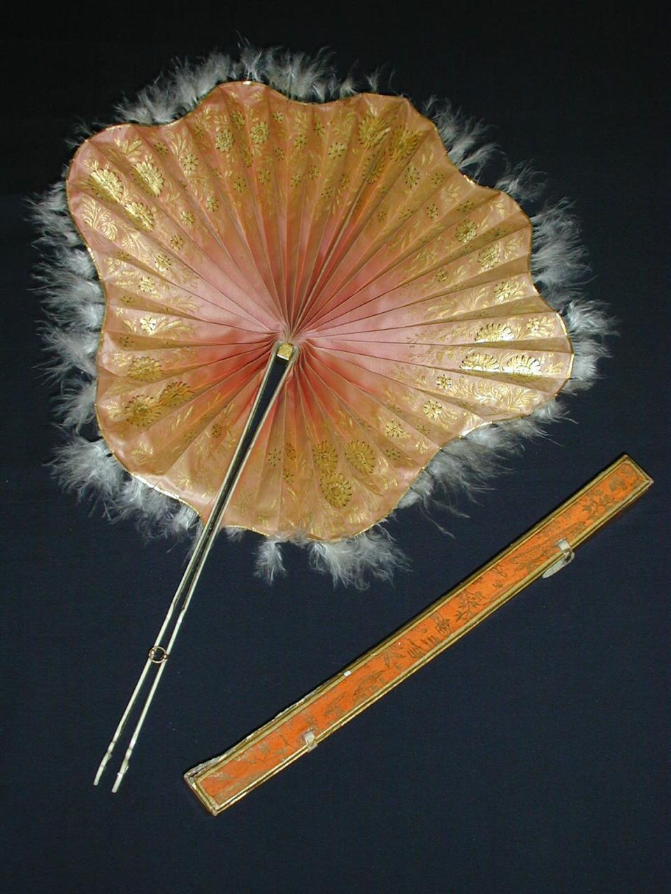 - Cockade fan with a pink, shovel-shaped silk leaf painted with gold flowers and edged with white feathers. The ivory guards, which also form the handles when open, are inlaid with gold leaf. The handles are held closed by a gold ring. The top of the fan, which is the centre when open, is protected by a decorative pinchbeck cap. The box is cardboard, the outside decorated with Chinoiserie and held closed by two pieces of ivory.