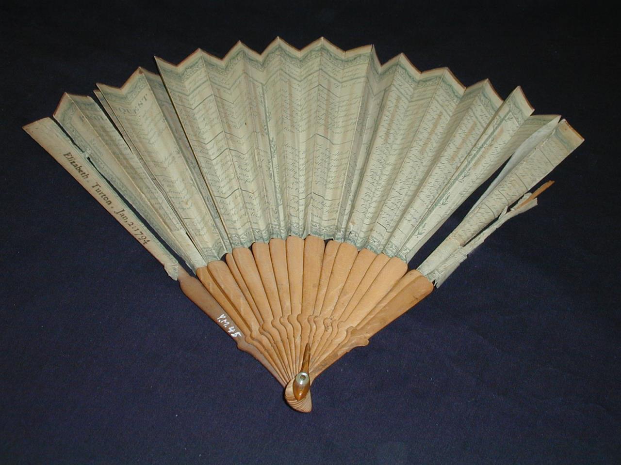 Fan with a double, printed paper leaf charting the history of England since the Conquest. The sticks and guards are wood. The rivet is metal with a mother-of-pearl washer.