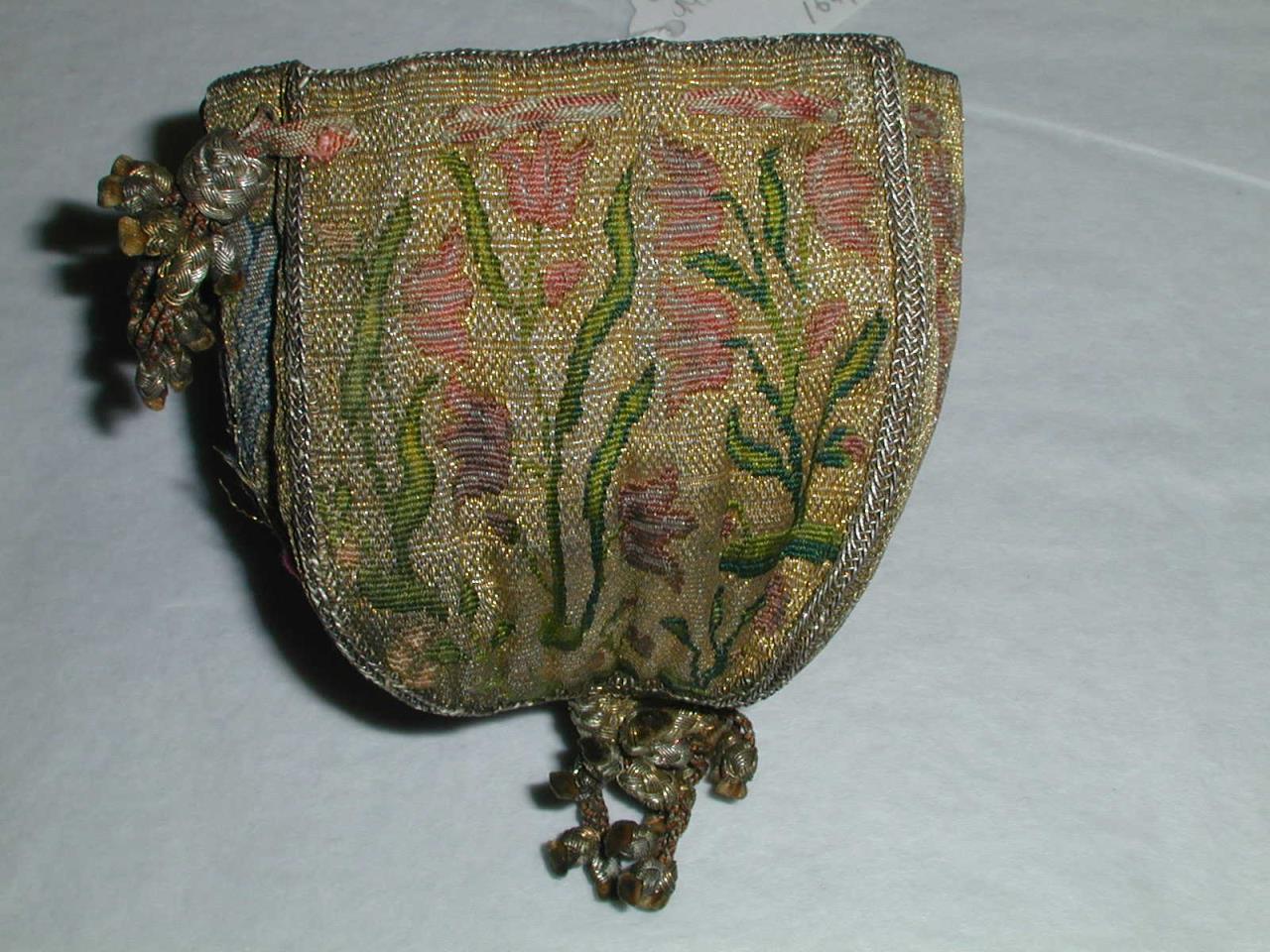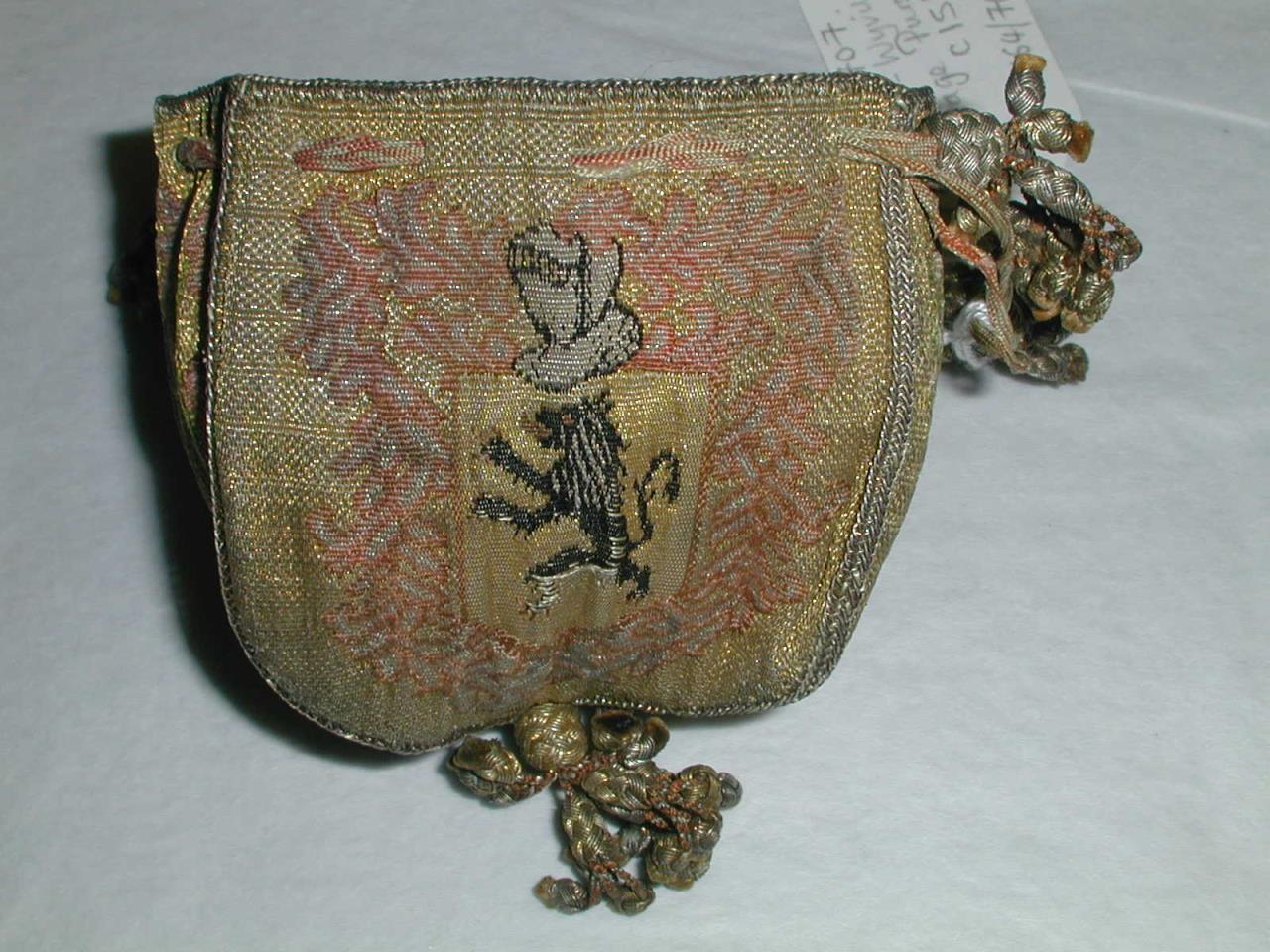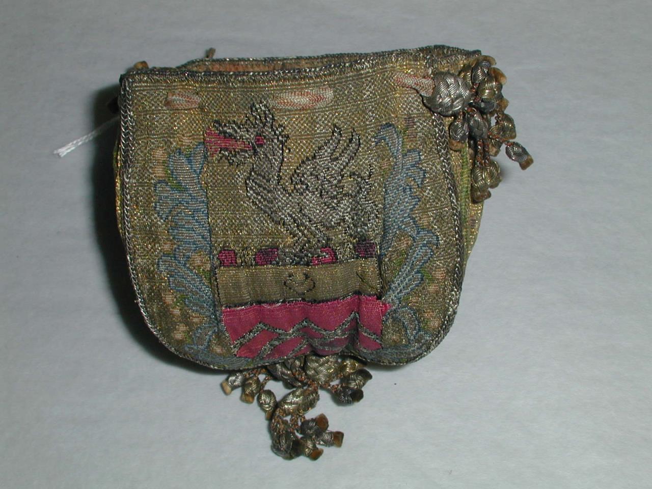 - Drawstring purse, woven in gold thread and coloured silk. Pink and yellow silk braid drawstrings with gold and silver tasseled knots. Lining of pink silk with a woven spot pattern. Shield shaped sides, with different patterns, Two coats of arms on opposite faces, the Stapleton coat of arms and the Wyvill coat of arms. The other sides have a deer with two trees and pink tulips. Corners edged with gold braid.