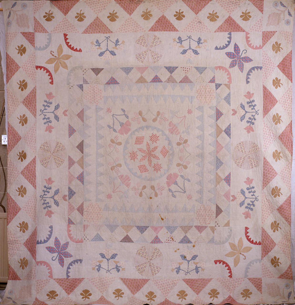 - Large patchwork, applique and quilted bedcover, made from plain and printed dress cottons. Predominantly pink, blue and white, with a backing of plain white cotton. Quilted with white cotton thread, with a thin cotton wadding.