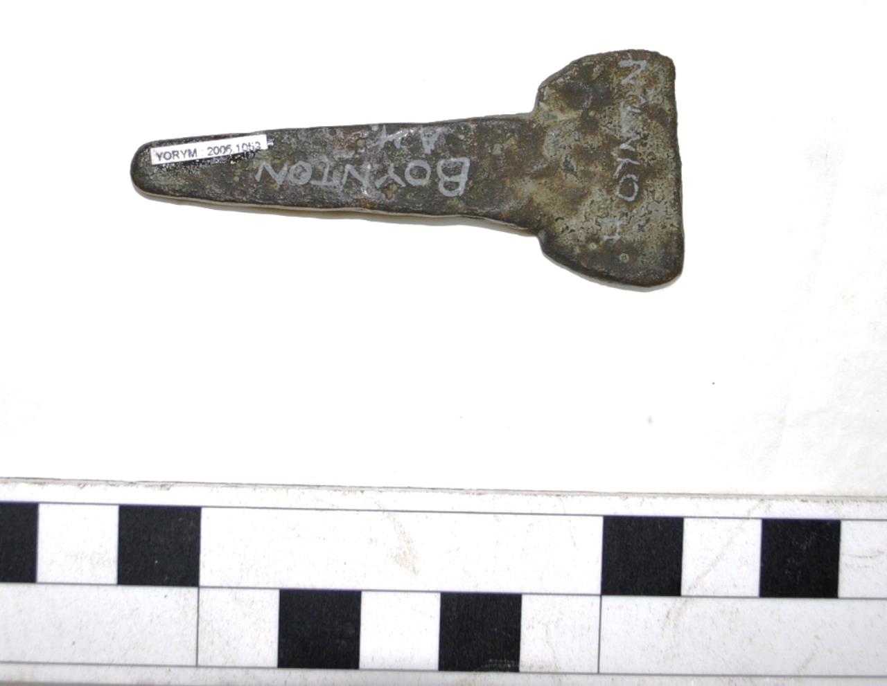 - Copper alloy implement. Chisel. Tang and shoulders with blade.