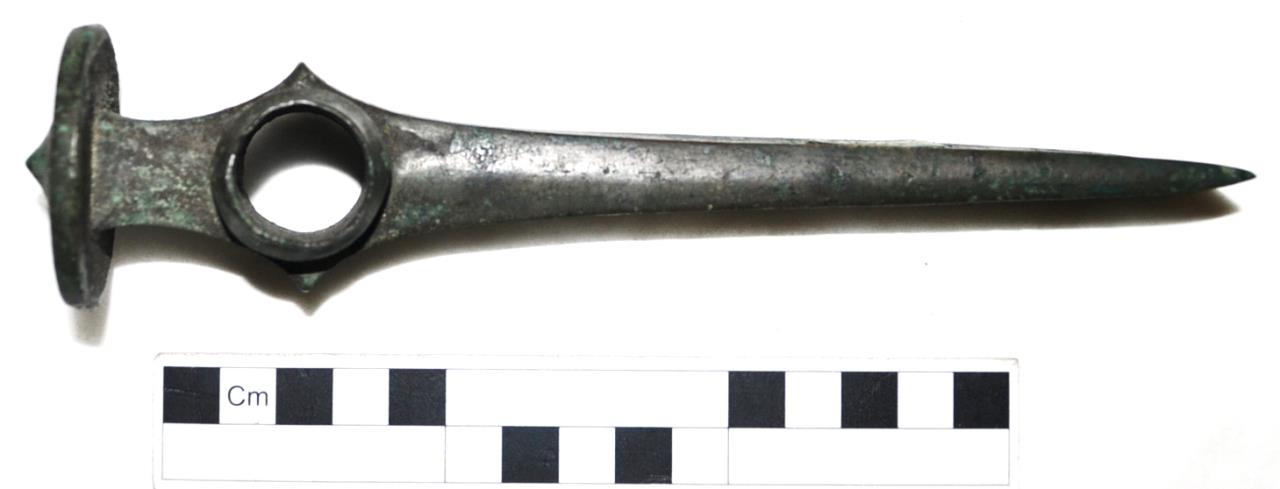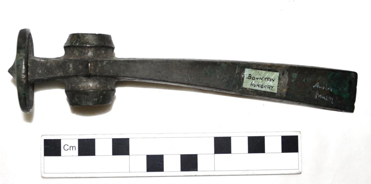 - Copper alloy implement. Shaft hole Battle-Axe. Long narrow blade complete, slight chip.
