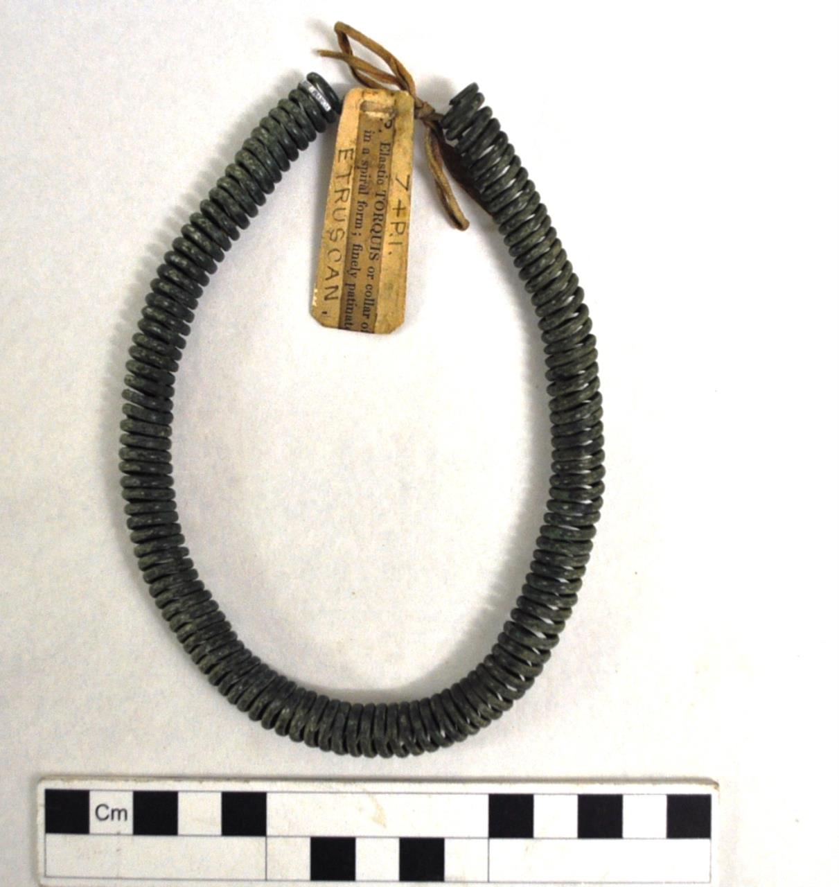Copper alloy torc of spring design. Thick bronze wire twisted in spiral shape to form spring. Very good condition. Labell attached says: '7+P.I.' Etruscan.
