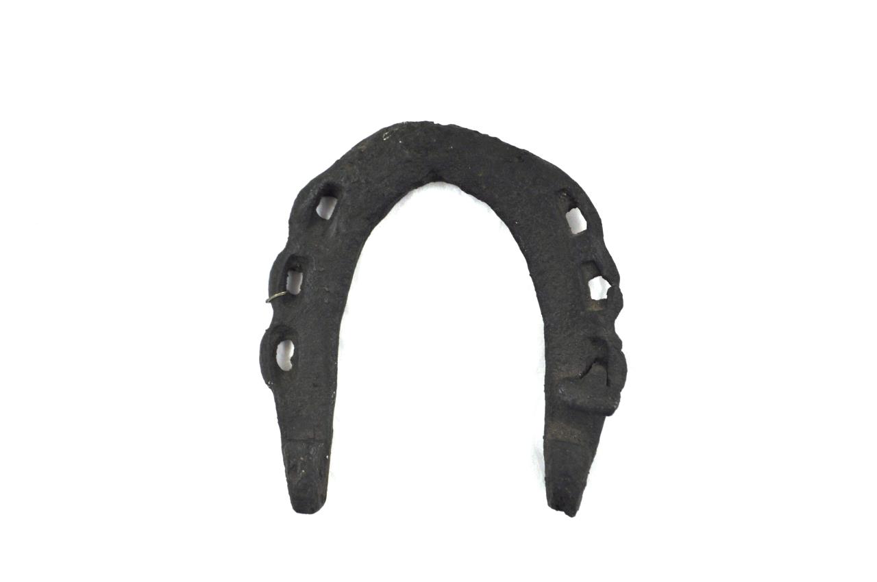 - Medieval Small Find. Horse shoe. Iron. 6 countersunk holes for nails, punching out of holes has bulged the shoes outline. The terminal is turned over. One nail survives within shoe. Horse shoes of the same design can be found in roman deposits. Marked