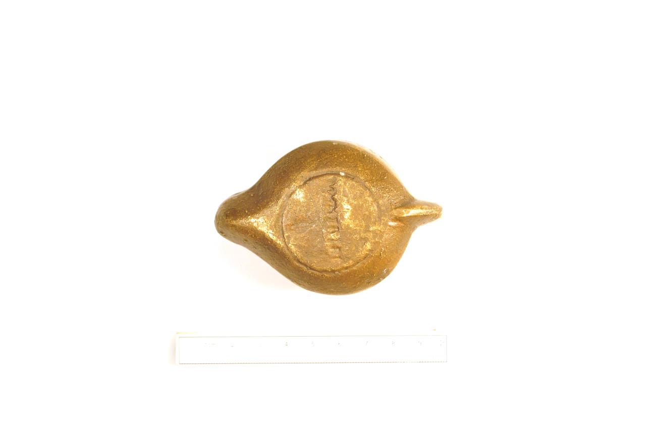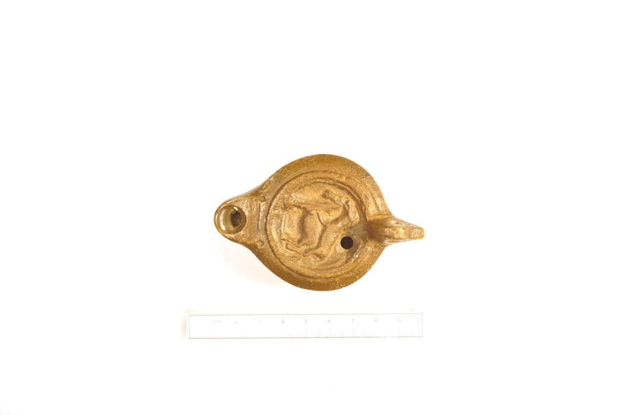 Replica oil lamp; copper alloy replica cast from the original ceramic lamp. Circular lamp with a projecting spout, a squat handle at the rear and a single circular perforation off-centre in the basin. Basin is decorated with a moulded decoration of two horses mating. The potter's stamp is visible on the underside but is illegible. A significant casting mark (from upper and lower halves) is evident around the circumference of the bowl.