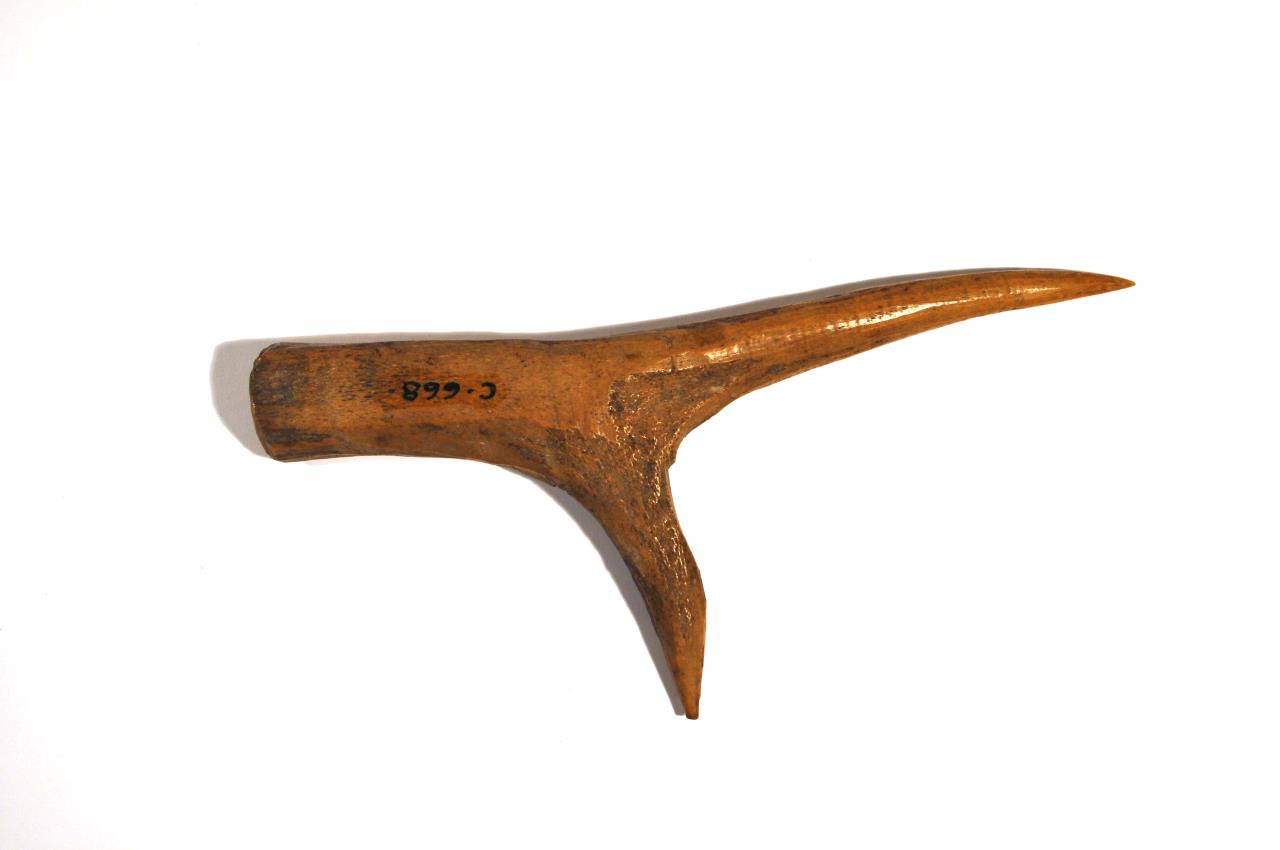 Y shaped cut from antler tine. Waterman 1959 describes it as "cut from antler... shows the beginning of a lateral perforation and is evidently unfinished.... These objects are called pendants without prejudice as to their actual use. Evidence of wear at the perforations suggests that they were intended for suspension and the decorated examples may indeed have been worn as ornaments. The distinctive shape, however, suggests that they may have been put to some practical use..." Possibly a lucet. See YORYM : 1948.619 and YORYM : C667 for other examples.