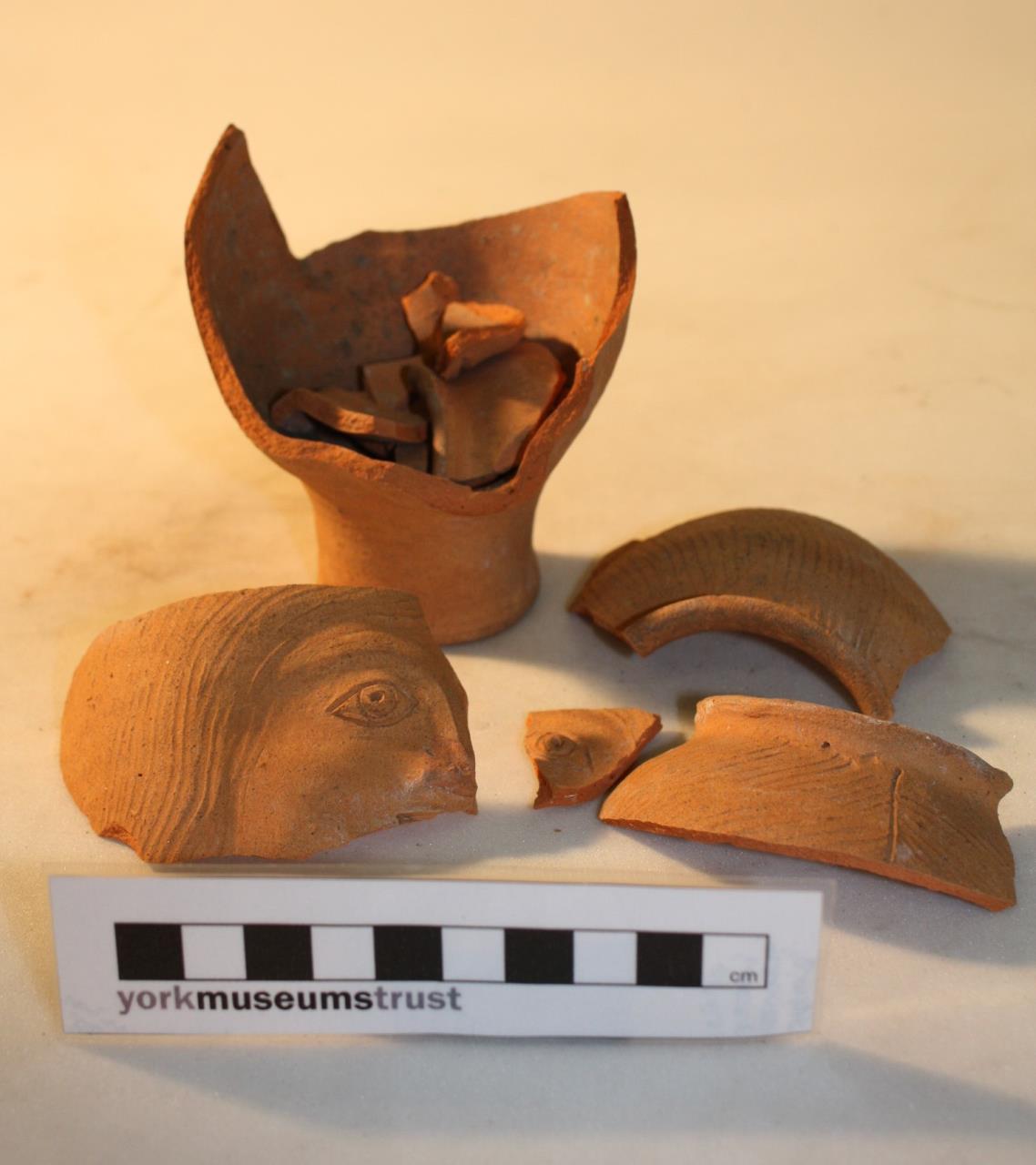 - Face pot. Delicate, thin fabric and small, neat face. Described in Eboracum as "face vase, possibly of the 2nd century, of orange buff self-coloured fabric. It was found with a triple vase (YORYM : 1971.303.438)..."