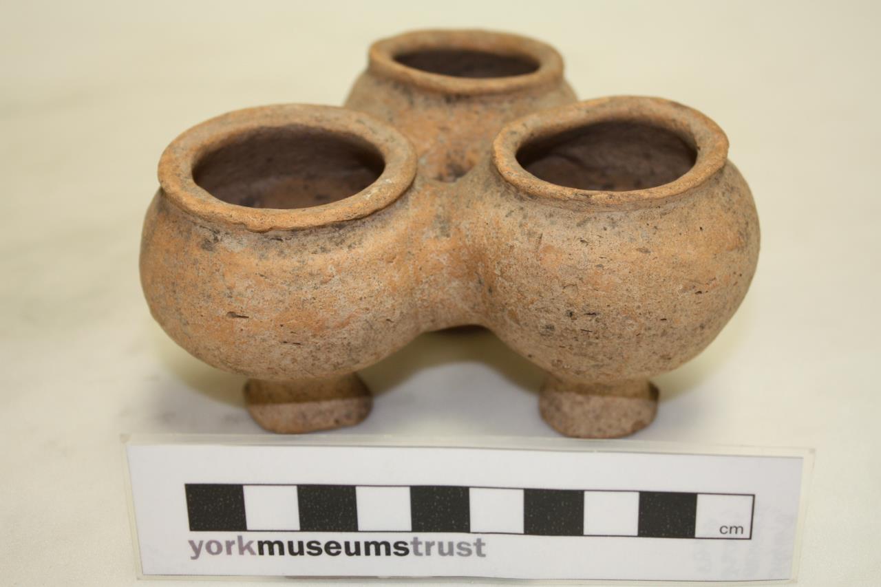 Vessel of three joined and linked cups. Each of the three cups is joined to its two neighbours by a perforation. May be an oil lamp. Described in Eboracum as "A triple vase of orange-buff fabric with traces of white." Found with face pot 1971.303.439