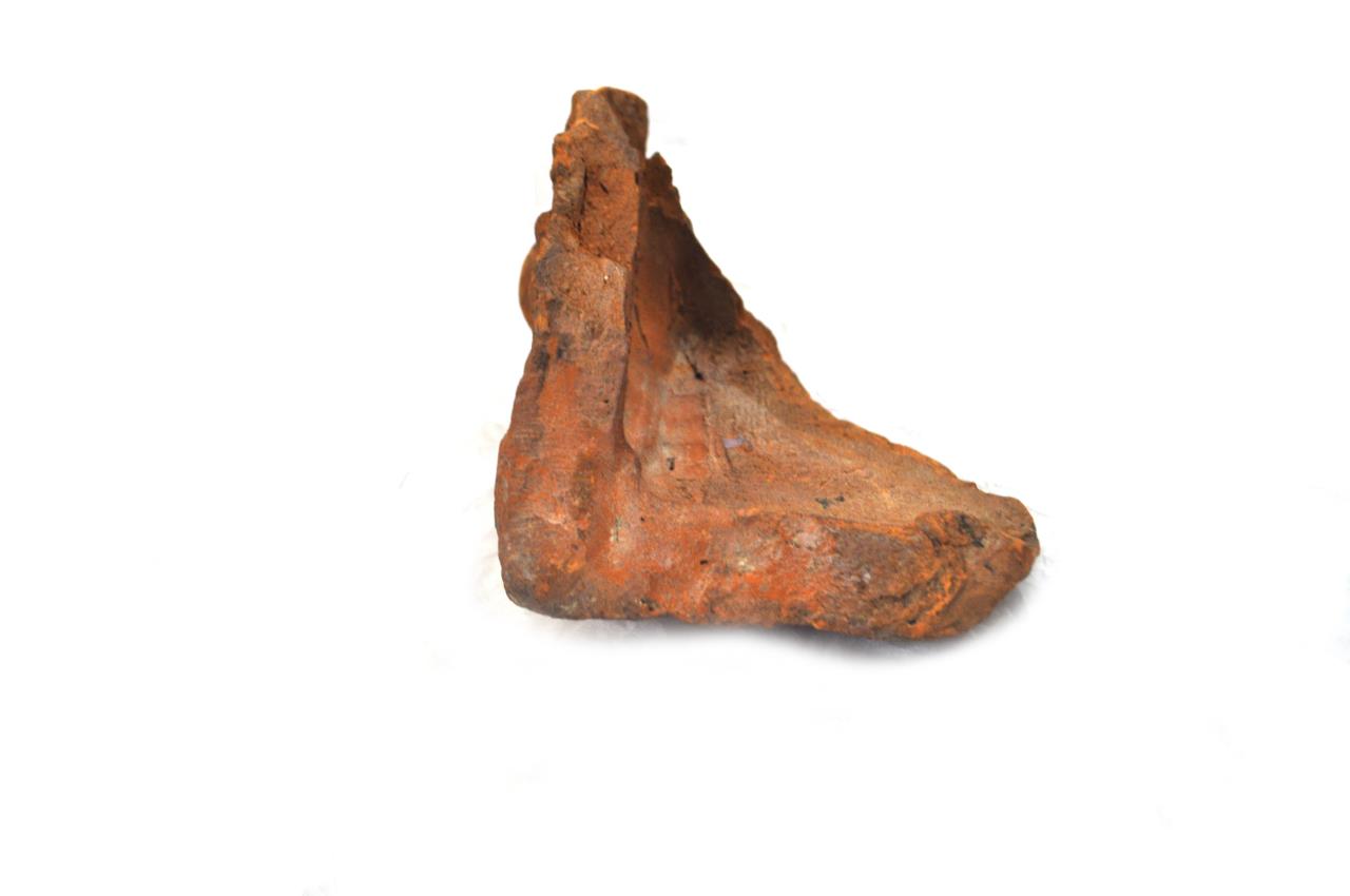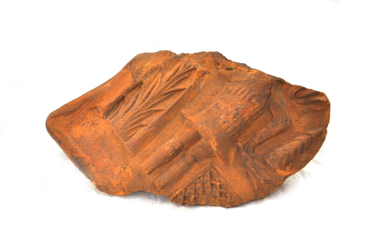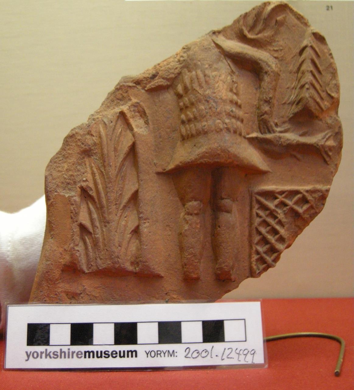 - Antefix showing a fisherman in relief. Described in Eboracum as "Antefix, terra-cotta, rectangular face with gabled top, now broken, 6ins by 7 and 1/2 ins; it has a flange at the back to fit over the ridge tile. On the front is a male figure, wearing a tunic, skirt and short breeches and holding a fish in his left hand; to the left of the figure is stylised foliage. Below the fish is a net and above it a fish trap."