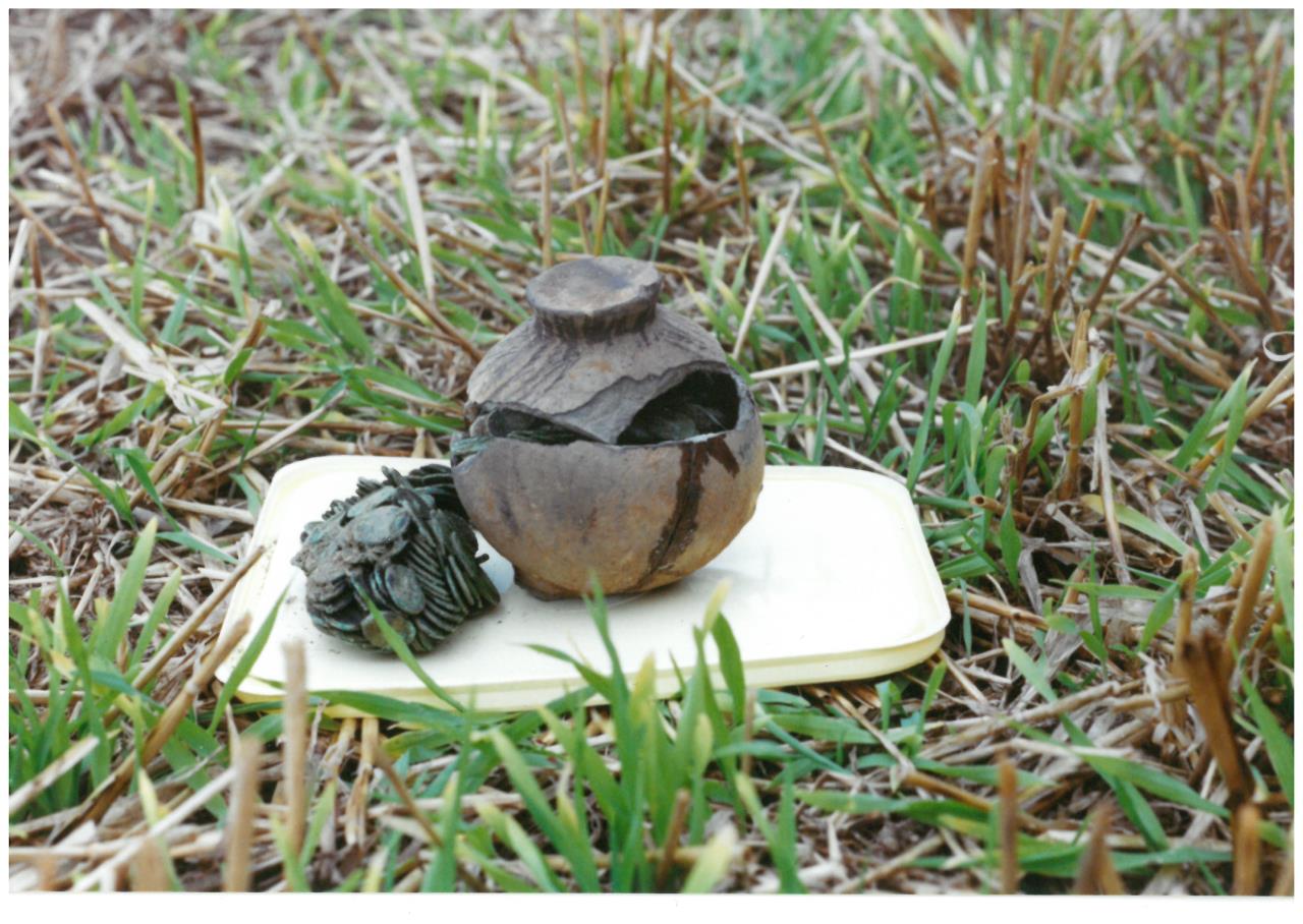 - Poppy-head beaker, grey earthenware. Re-assembled from thirteen fragments. Contained the Haxby hoard. Labelled 'Haxby Hoard, pot + sherd'.