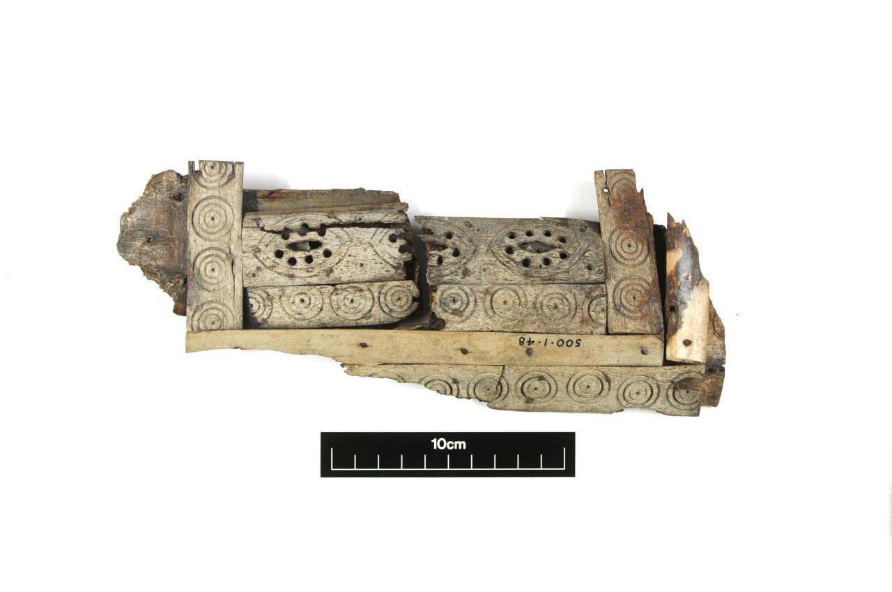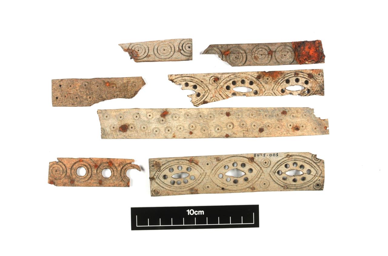 - Mount with concentric circle design. Waterman 1959 describes YORYM : 1948.500.1-500.6 as "Wooden casket with bone mounts. The fragments of an oak casket, covered with plain and ornamented bone strips, retained in position by flat-headed iron pins, about 0.35in long, driven in flush with the surface was found in the Coppergate Group A deposit. The engraved ornament consists for the most part of a simple, compass drawn, single or concentric circles, sometimes with open centre but a more elaborate openwork, set within an incised pointed-oval, is backed by thin pieces of sheet bronze, evidently gilded on the upper surface, which when new would have served to emphasize this feature of the design."