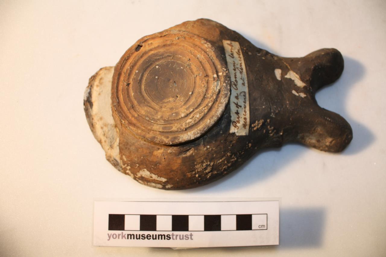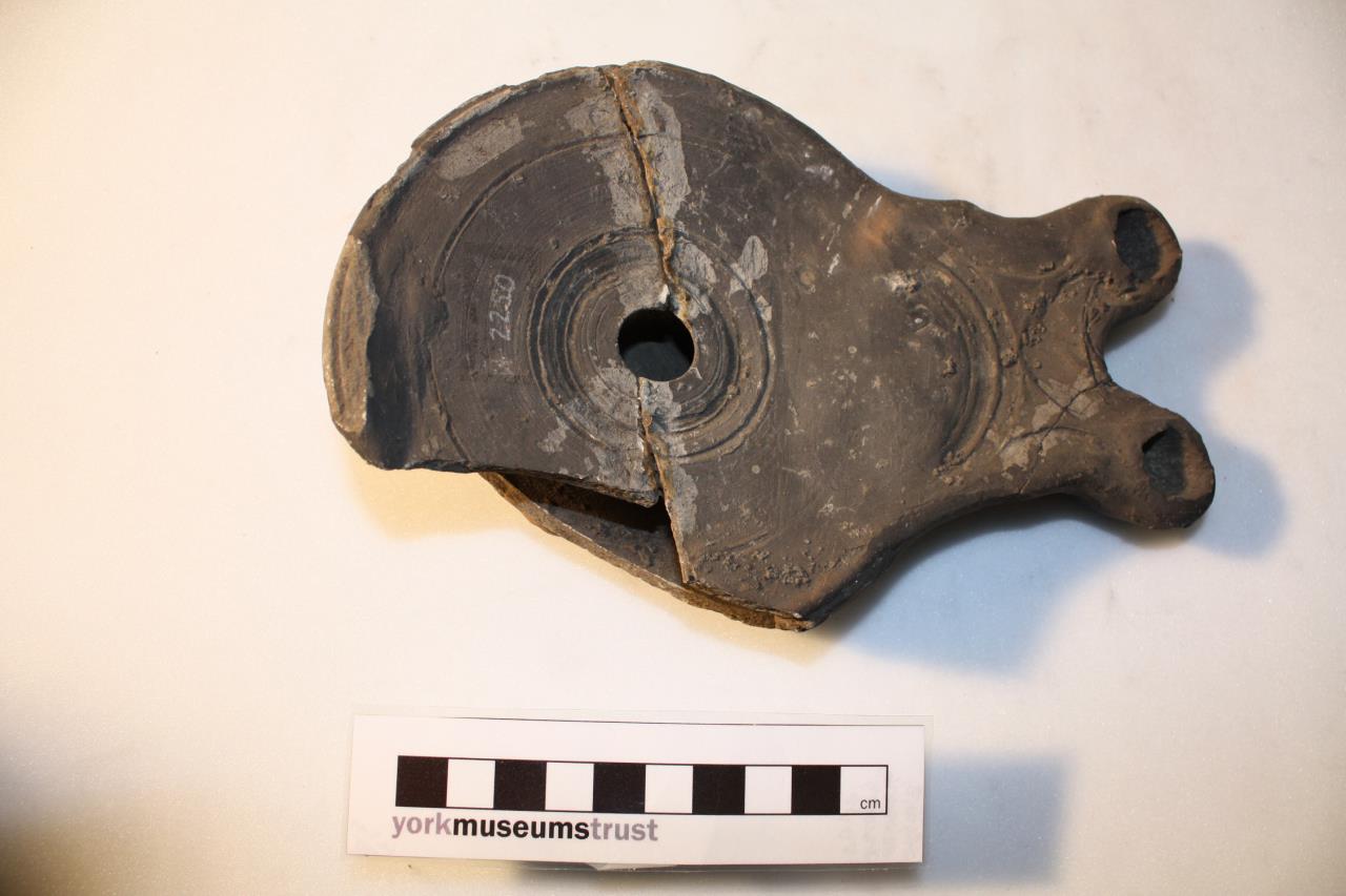 - Large oil lamp with two projecting wick holes. Plain top with faint mouldings by wick holes. Concentric circles on base.