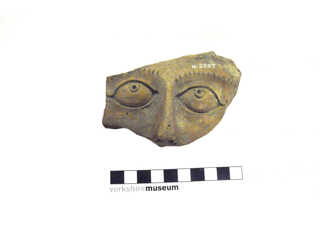 - A fragment from a face pot. The piece is a face comprising upward glancing eyes, eybrows and a thin nose.