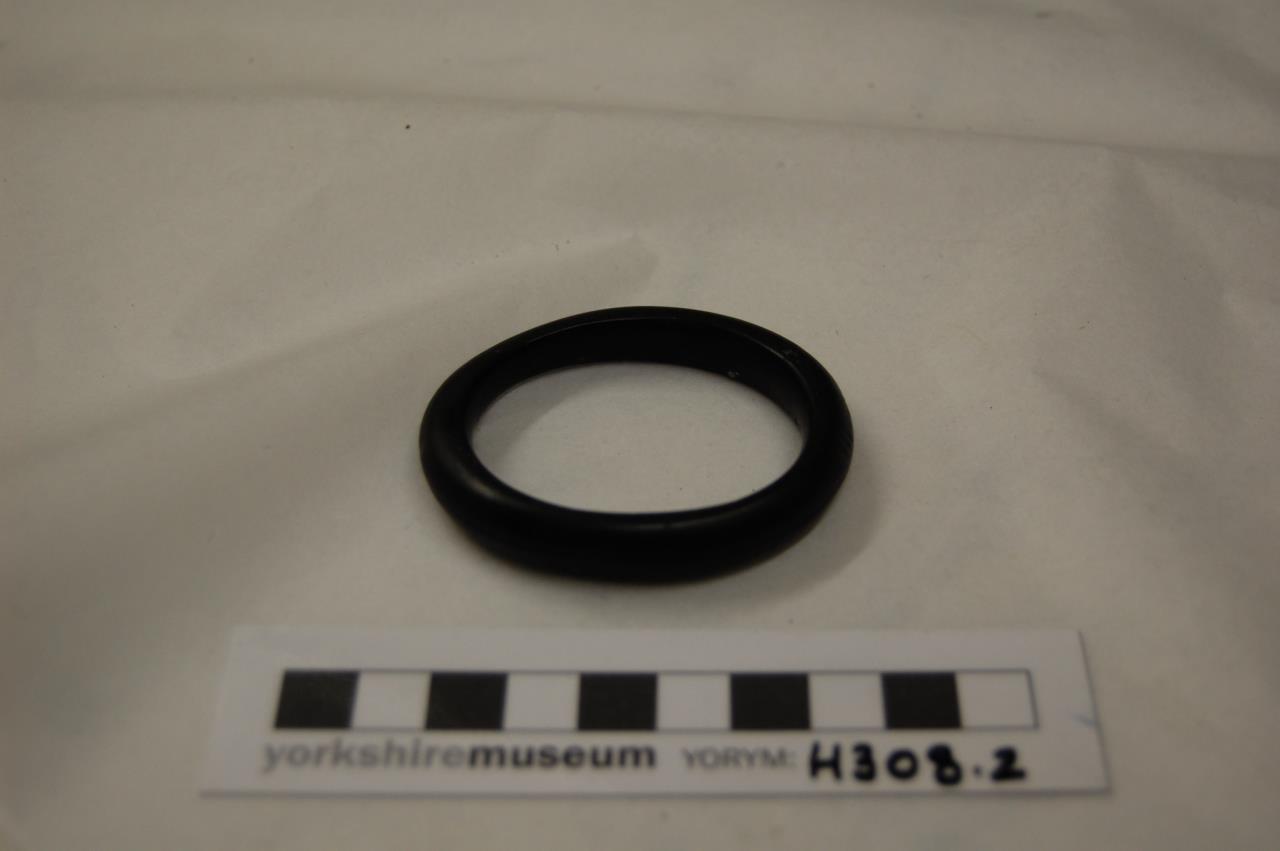 Oval annular armlet of semi-oval section with concave inner face. The line around the outer face and areas of oblique notching may be signs of worn decoration or traces of manufacturing techniques. Or possibly a hair ring.