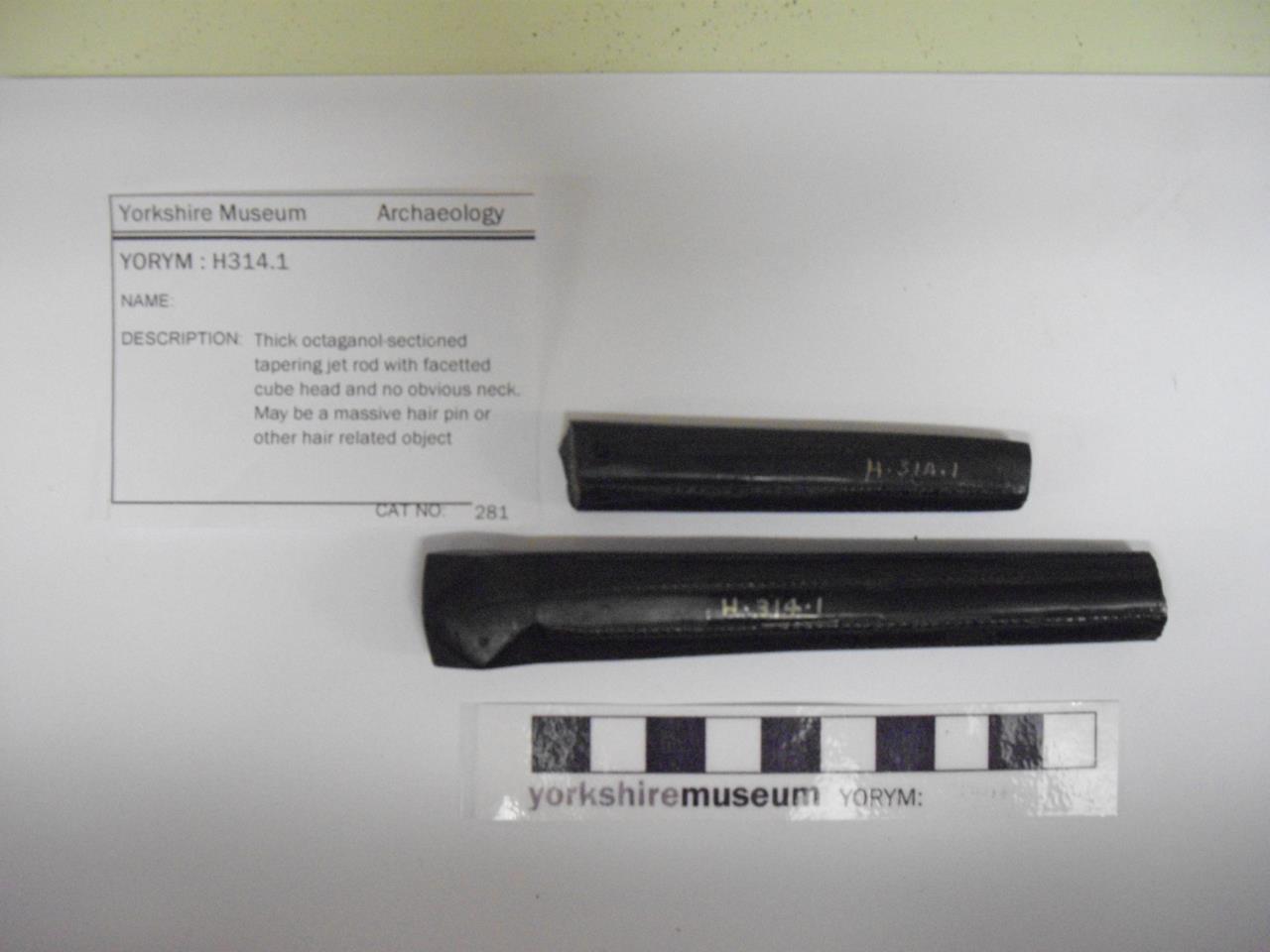 Thick octagonal-sectioned tapering rod with a faceted cube head but no obvious neck. The shank has a line of notches down each angle giving a cable design. The pin is in two pieces; the narrower end has a 23 mm long socket drilled in it. Recorded as a distaff in Eborcaum. Now thought to be a possible hair curler or ringlet maker.