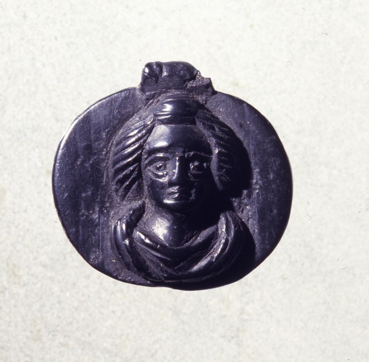 Oval pendant with the bust of a female carved in relief with a wide plain border on either side. Her hair is worn in a topknot (possibly a cap) with the side hair pulled back in strands to frame her face. The draperies around shoulders suggest a shawl worn over a cowl-necked dress. A decorative suspension tube runs across the top of the pendant. Both surfaces are dull. Eboracum described it as "...has a lug at the top perforated for suspension....a horizontal oval pendant.... exhibits centrally on a flat ground a draped female bust in relief with hair arranged in a double parting on either side of a central chignon or cap."