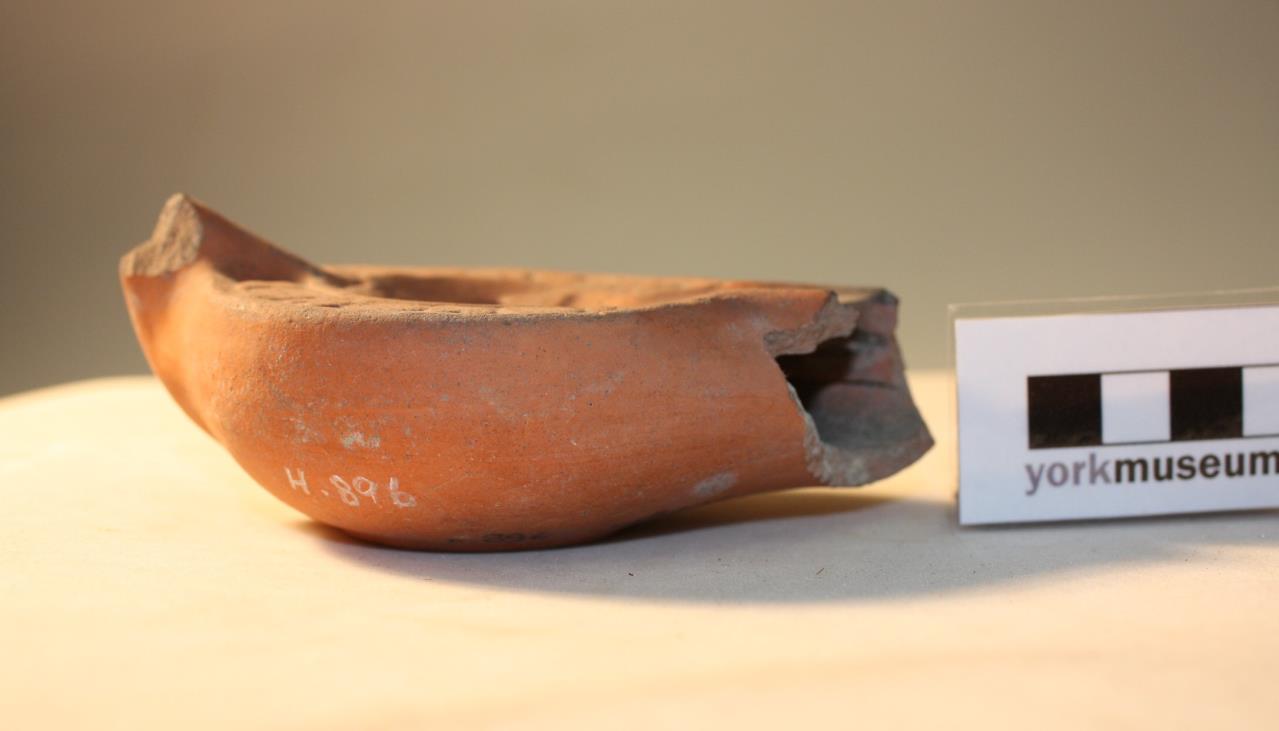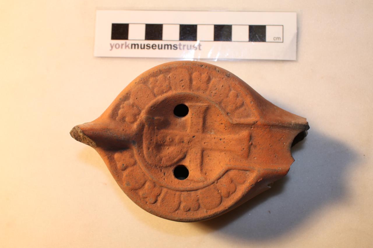 - Incomplete firmalampen (factory lamp) of Loescheke (1919) Type X. Rounded, lamp with a shallow basin and two circualr perforations. The mouth is broken. A short, thick handle at the back is also broken. A squat, pedestal foot is on the underside. Moulded decoration on upper face consists of a stylised Chi-Rho (XP) symbol in the basin surrounded by a repeating freize of alternating ovals and crosses. The lamp had been fired.