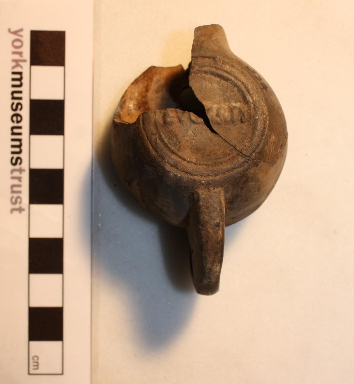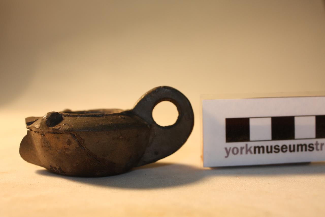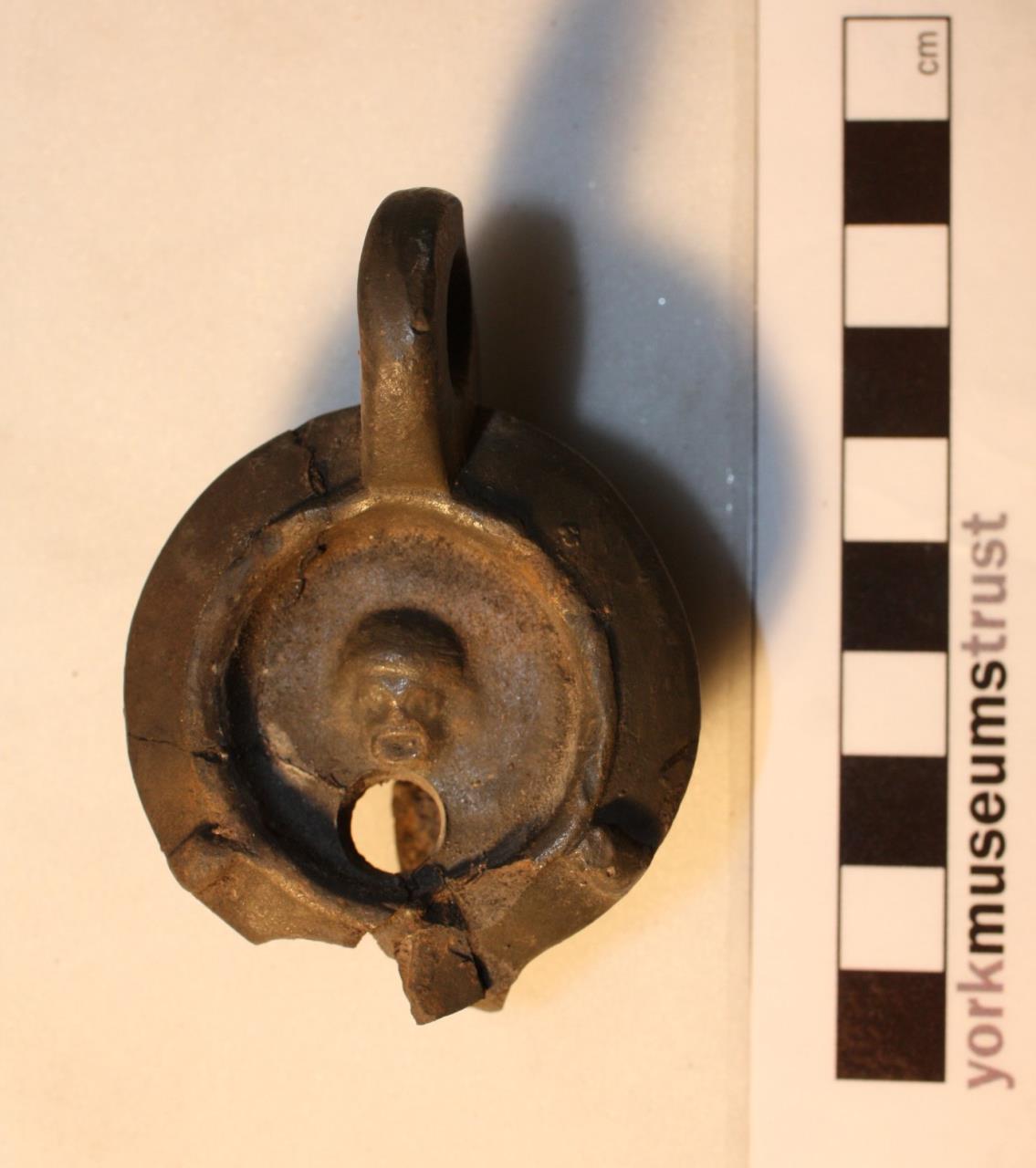 Brown colour-coated oil lamp with central relief image of a face or theatrical mask with wide open mouth. Incomplete and illegible inscription in relief on base. Pierced vertical handle.