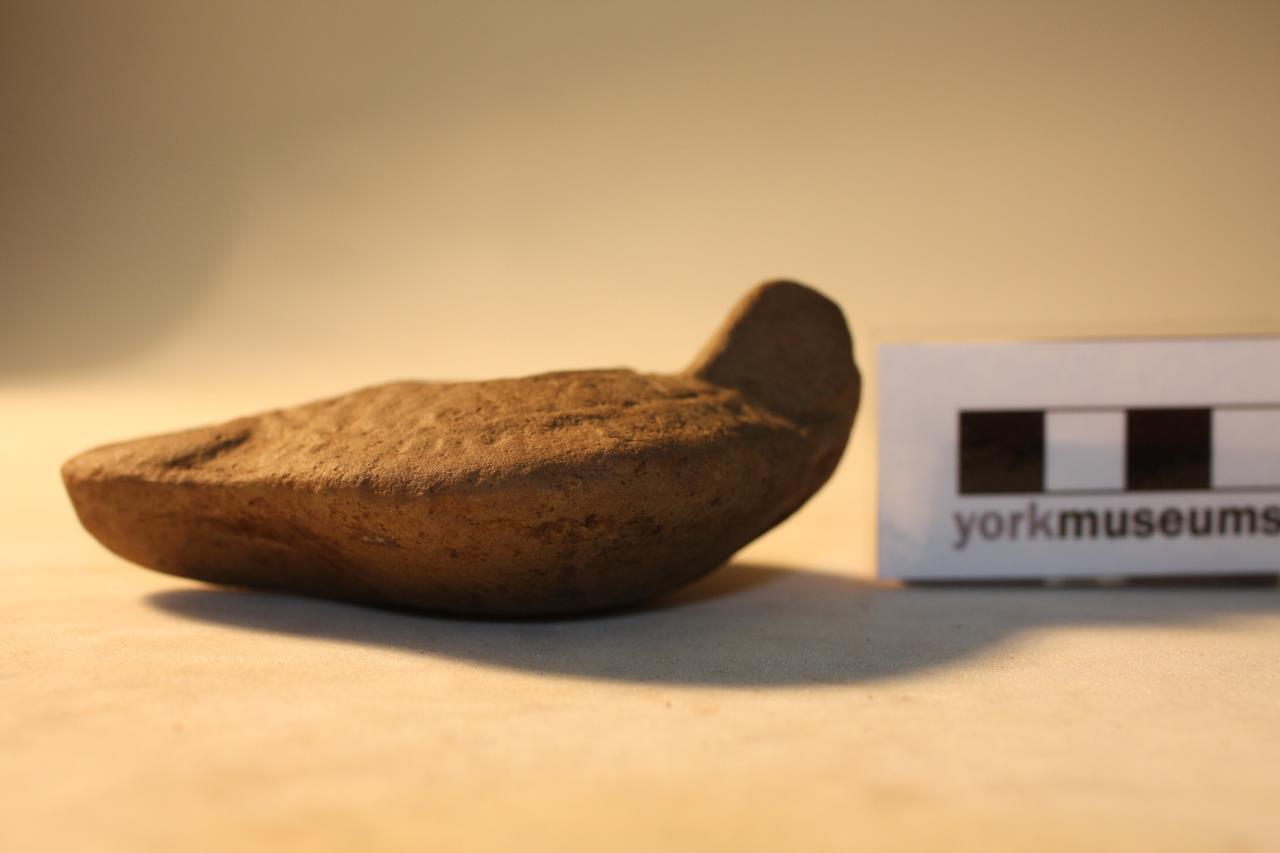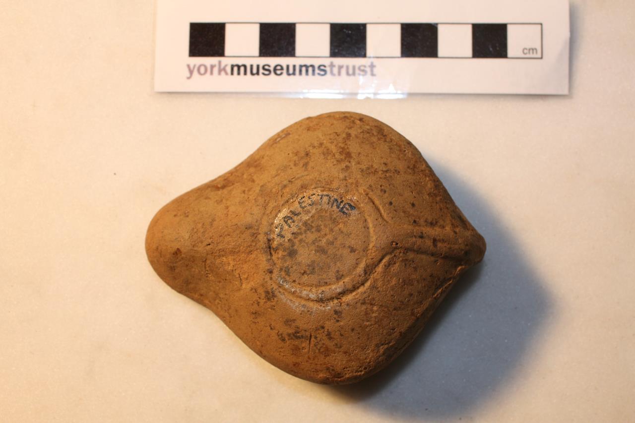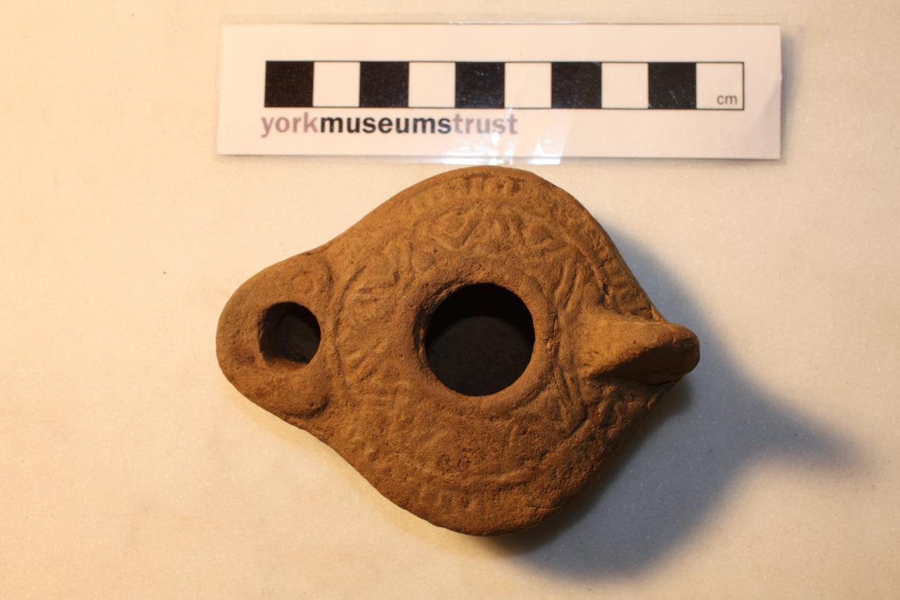- Leaf- or eye-shaped oil lamp with large central opening. Impressed zig zag pattern around central opening. Unpierced vertical handle.