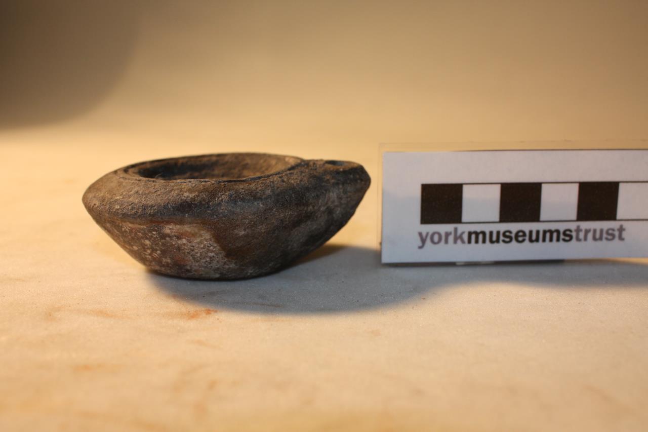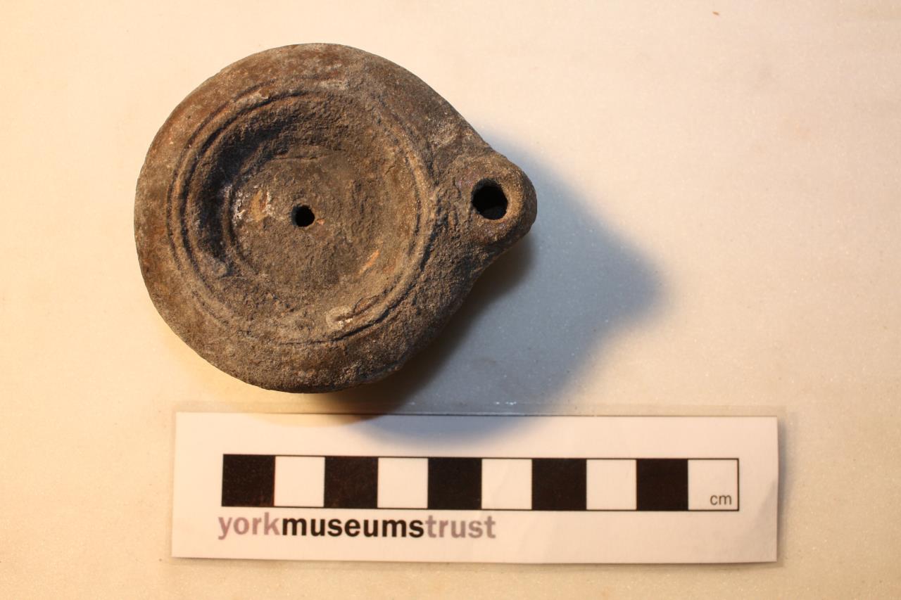 - Circular oil lamp with small central opening and no handle. Inscription on base :'STROBI'.