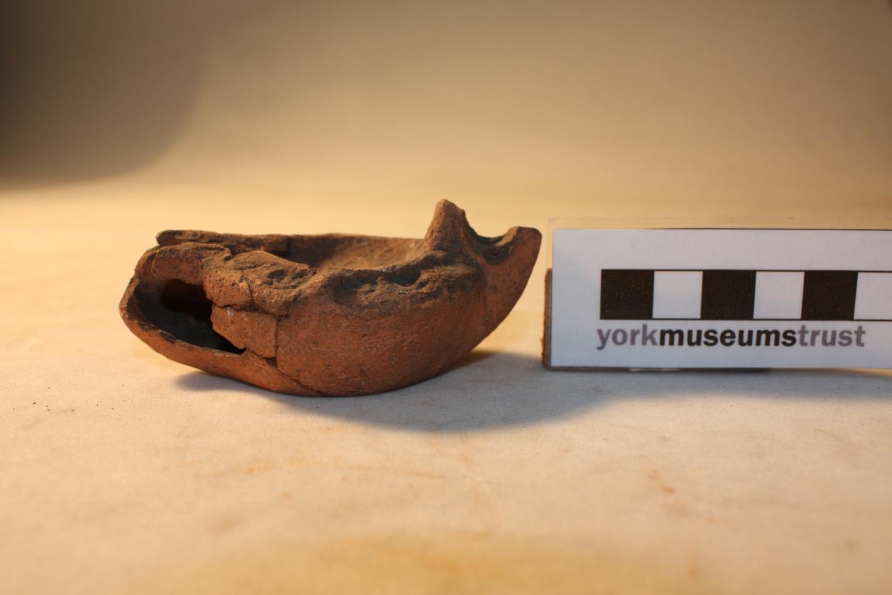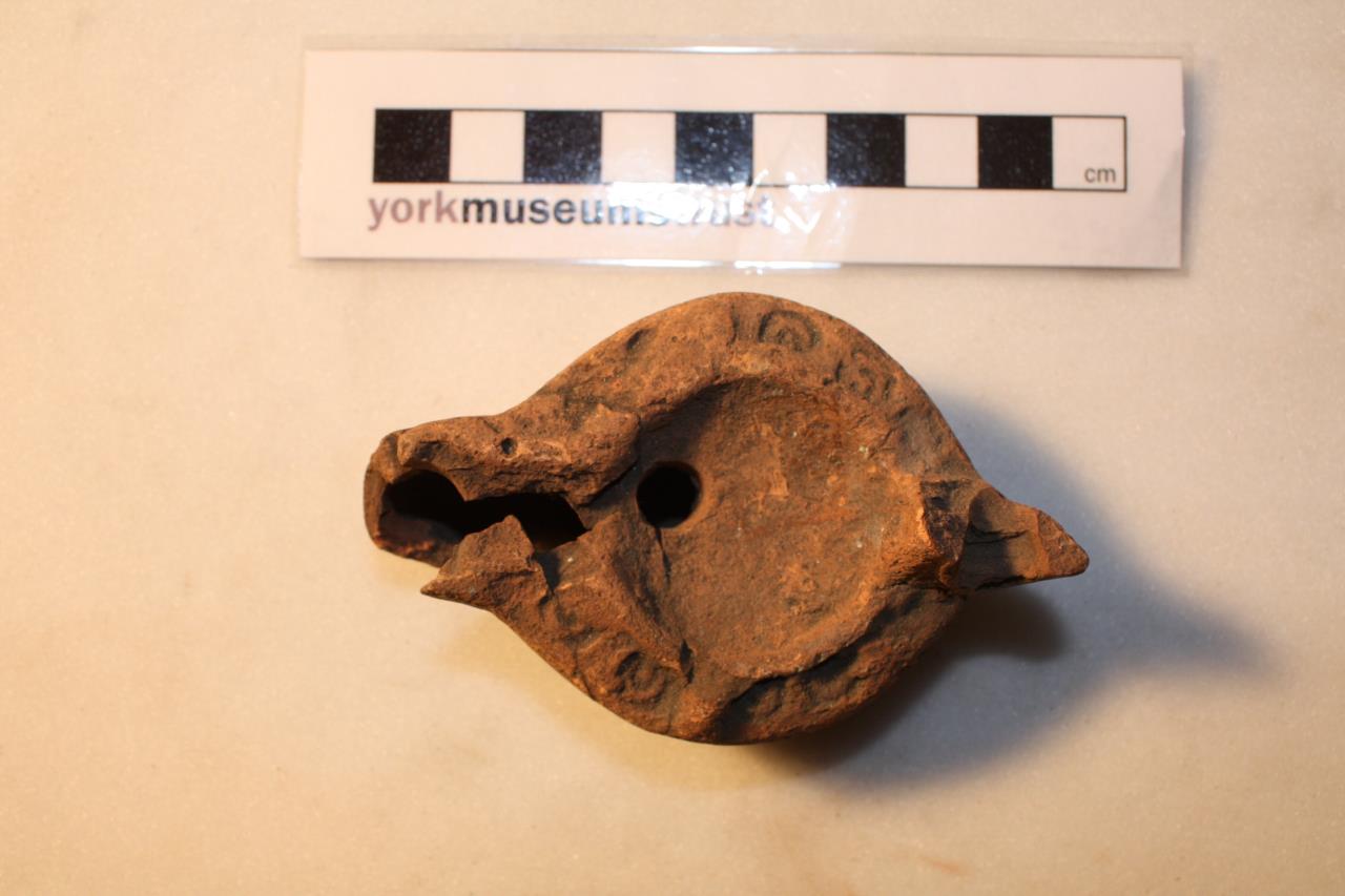 - Oil lamp with off-central central opening, and impressed horse-shoes shapes around shoulder.