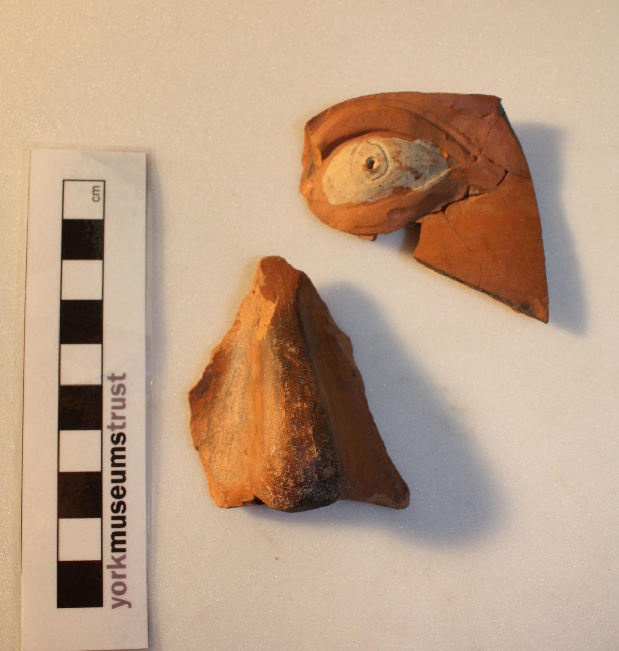 - Two fragments from a Face Pot. An eye and nose, with decoration in white.