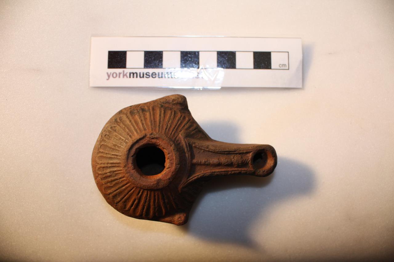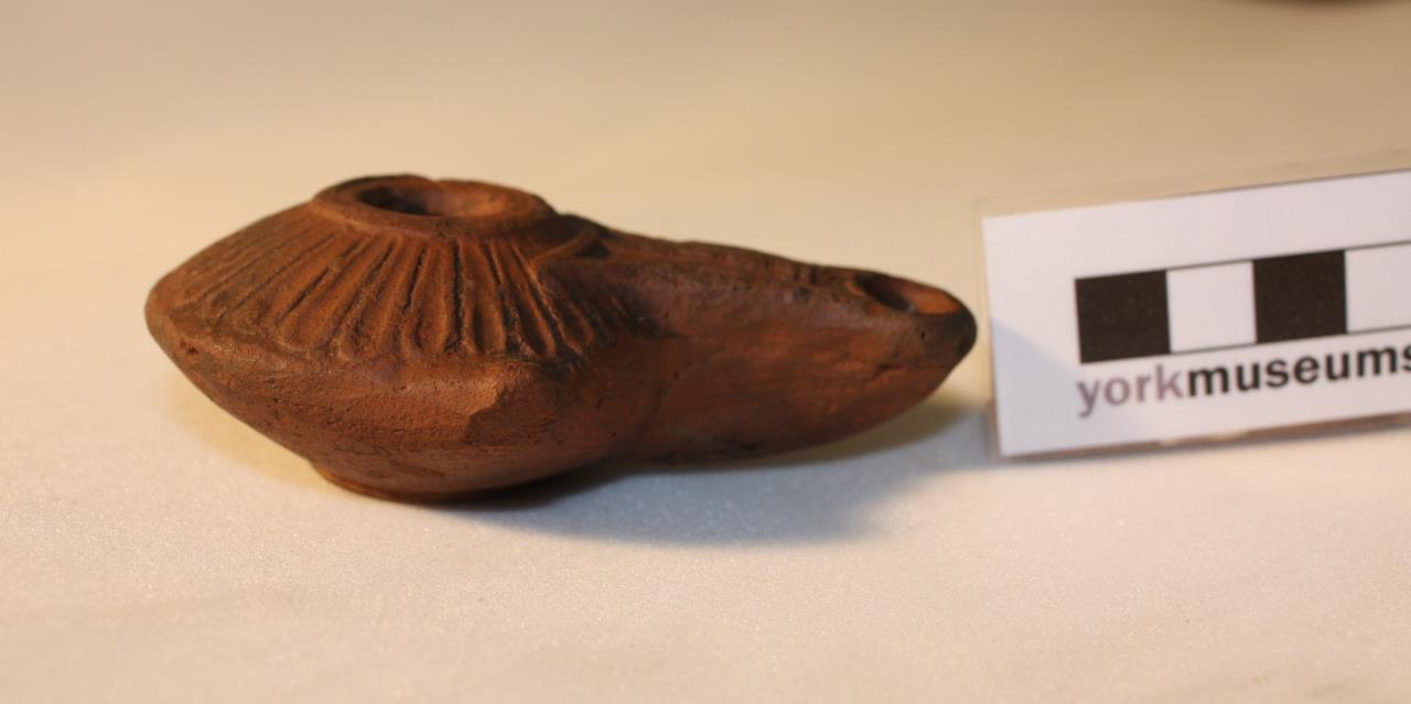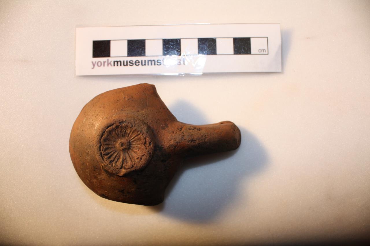 - Oil lamp with long spout decorated with a flaming torch, the symbol of Mars. Radiating petals around central opening, and small flower on base.