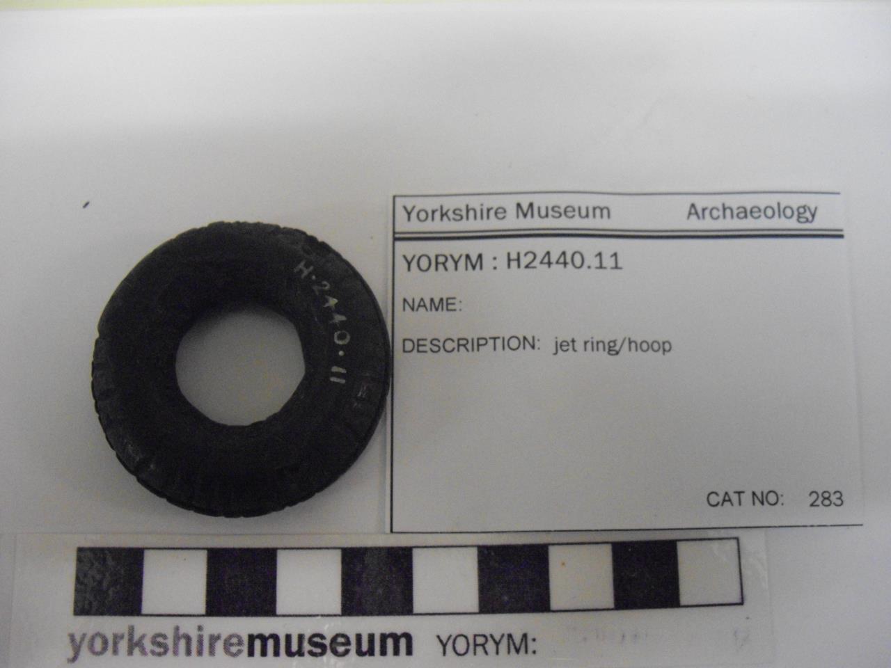 - Annular ring of oval section. Outer circumference is decorated with two channels with transverse grooves on either side. Further transverse grooves run around the hole and the edge on both faces.