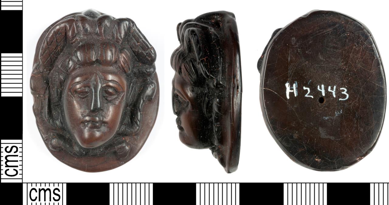 Oval Medusa pendant. Small suspension hole drilled through top. Medusa's small winged head-dress is decorated with scored cross-hatching. Four stylized snakes are arranged with one either side of her face and two emerging from her chin. Both faces are polished. Eboracum describes this as the best of the York Medusa pendants, continuing: "The Gorgon, very well carved in relief, occupies the whole of an upright oval... perforatons for suspension being hidden in the hair."