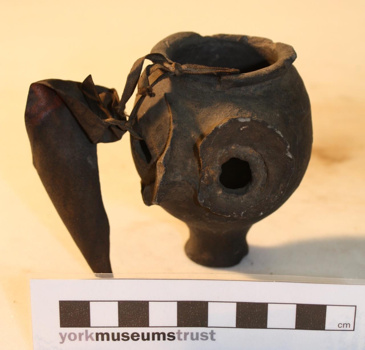 One section of a three-lobed lamp or possibly puzzle jug for drinking from. Pedestal base, holes in side for other lobes. Illegible label attached; label inside reads: 'One of the lamps used by the Antients [sic] to burn constantly in their Sepulchres, found in one of the vaults of the Nunnery at York'.