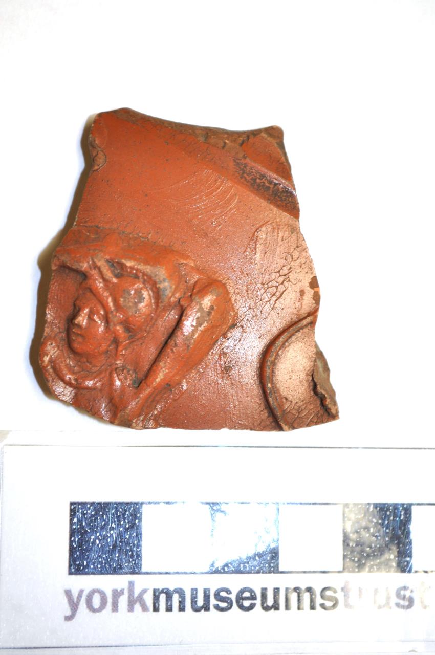 - Body sherd from samian ware vessel, decorated in relief with a human figure with club and helmet. Possibly painted with modern orange paint.