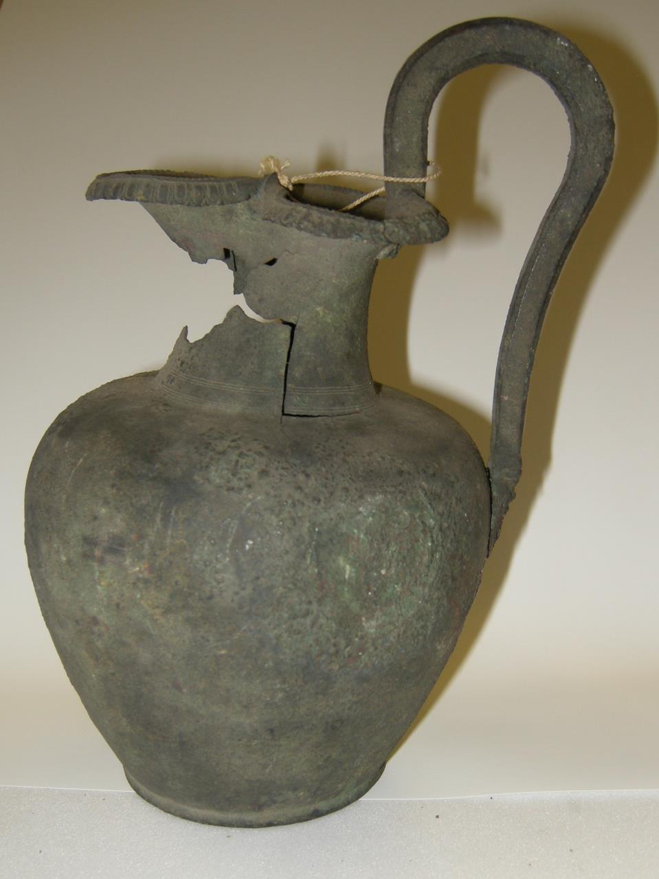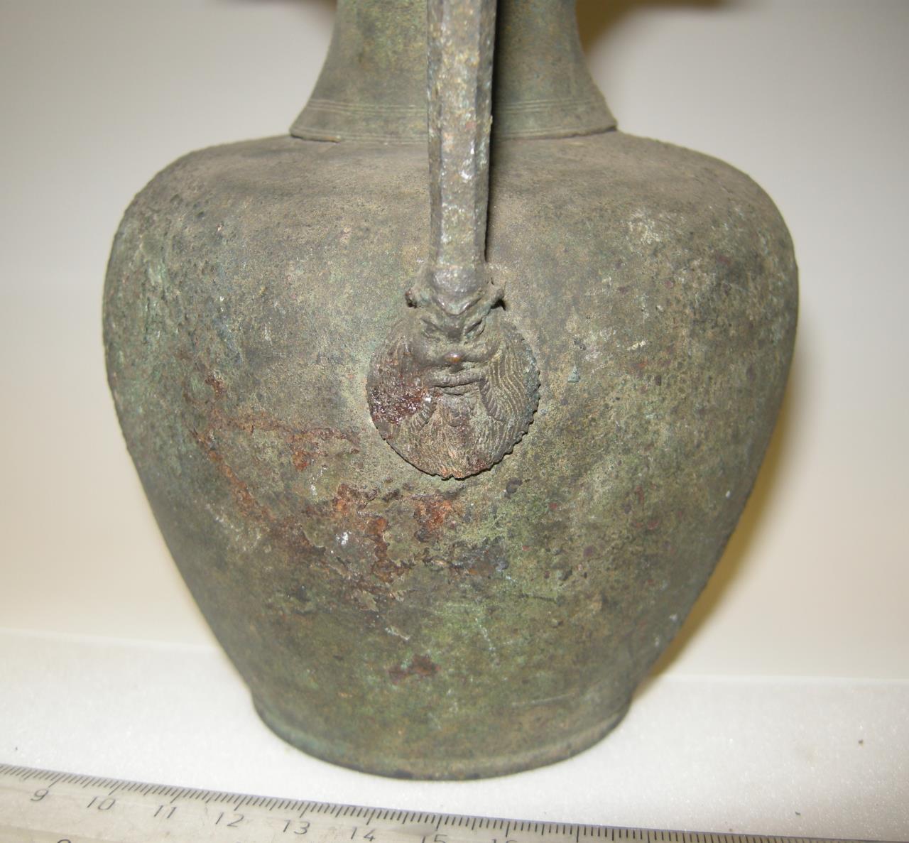 Copper alloy jug with turned body and trilobed rim decorated with beading and egg and dart. Attached handle held in place with three rivets to the neck and one to the body. The bottom of the handle is decorated with a bearded and moustachioed face with upturned pig-like nose wearing a helmet and with short horns. This may represent Bacchus, god of wine. This jug was used to pour libations during festivals and feasts.