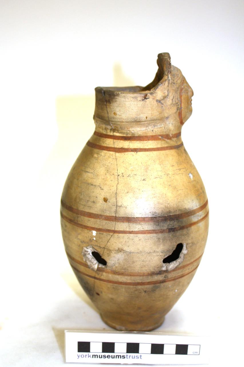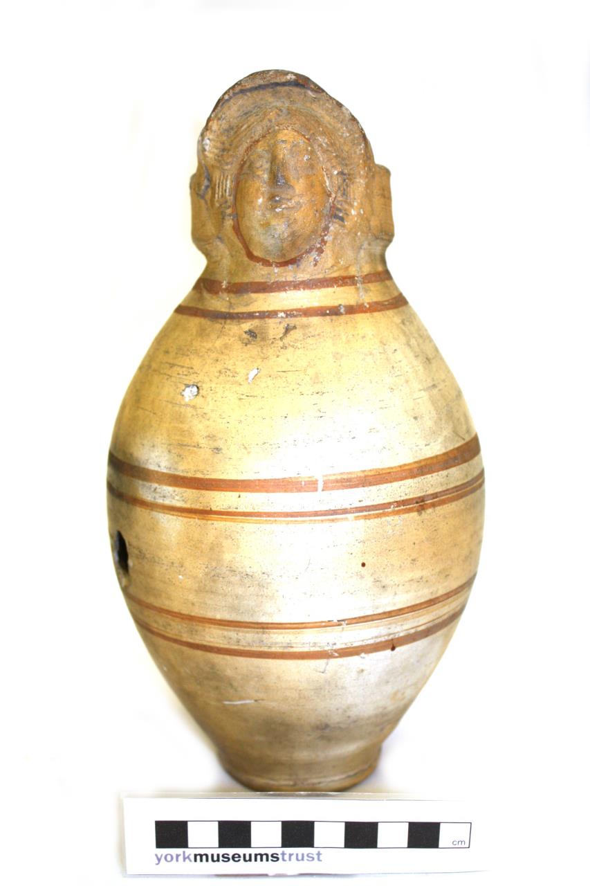 Ovoid Crambeck ware vessel, with moulded female face in relief projecting above rim. Dark red-orange details, including six horizontal stripes around body. Labelled as mask or face vase.