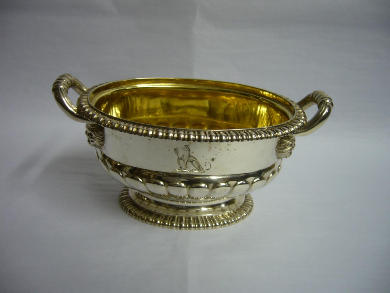 - Georgian two-handled silver salt. Gilt interior with engraved crest of greyhound on front. Date letter V.