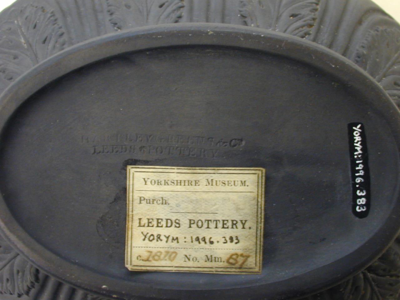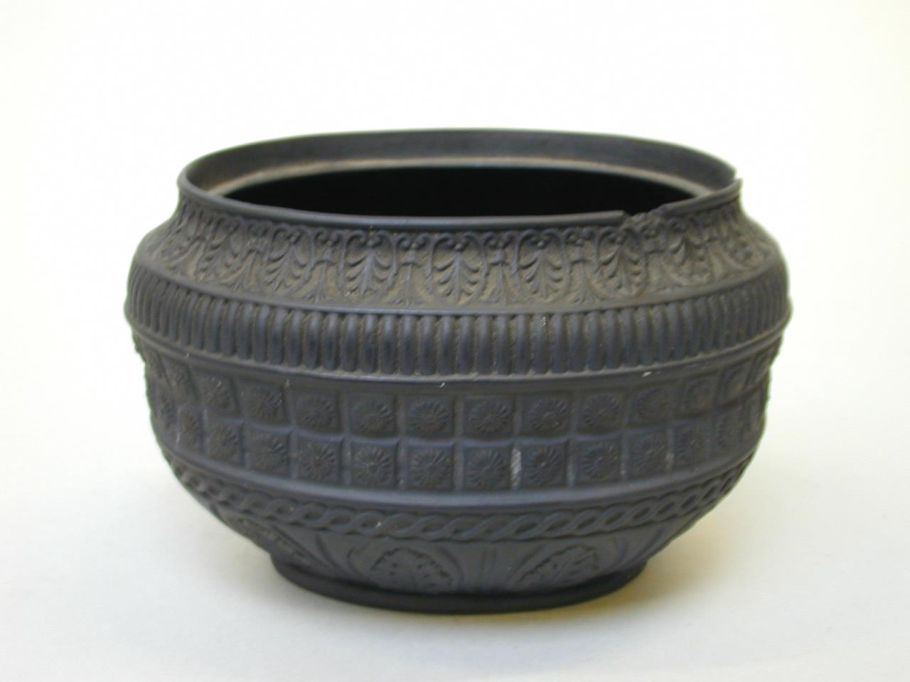 - An oval sugar bowl in black basalt. It has moulded decoration of foliage, chain patterns, reeding and flowered dice patterns. The cover is missing.