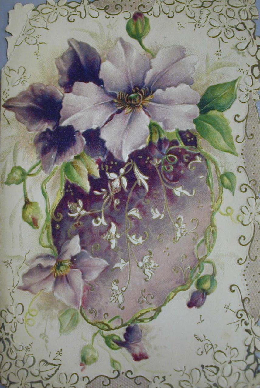 - Folded card featuring a purple clematis and decorated edges.