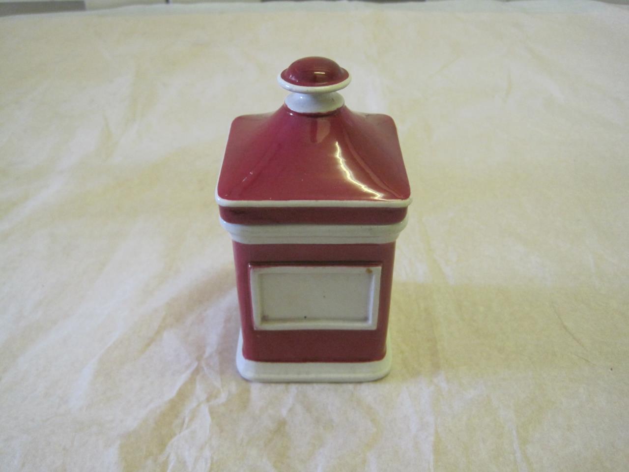 - Glazed earthenware drug jar in white and red. It is square with blank name panels on the sides. The base is impressed 'Trade Mark Y.G. Co 10'.