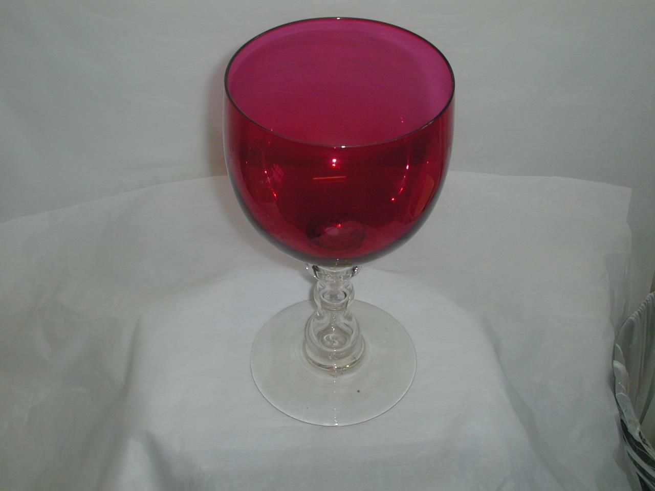 - Glass goblet with rose coloured bowl, shaped hollow stem and circular foot.