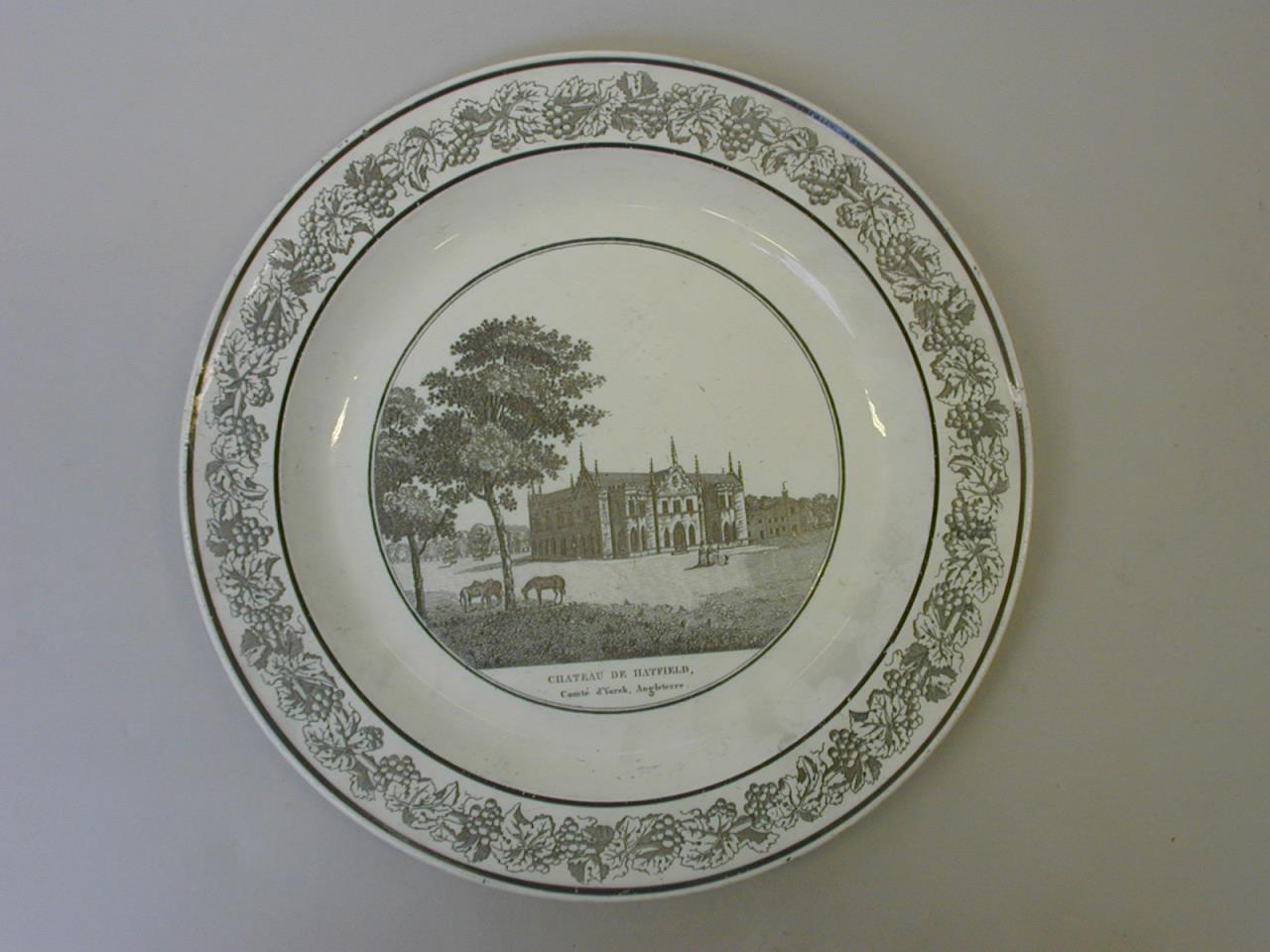 A Creamware plate decorated around the rim with a black transfer print pattern of grapes and foliage. The central well has a black transfer print of a large house in its own grounds with figures, horses and trees in front.