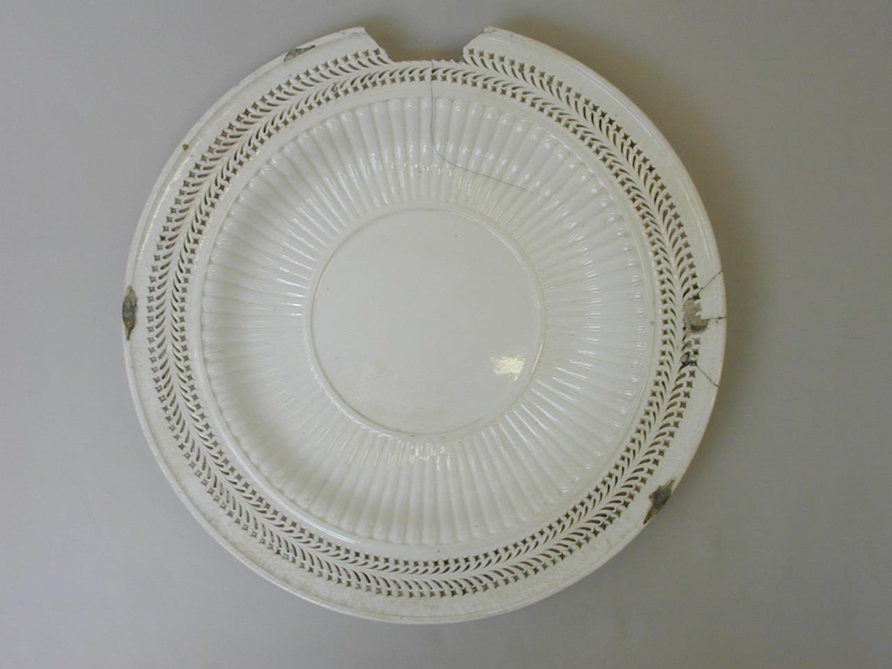 - A large Creamware serving dish or stand with a pierced, decorated bevel and a moulded, ribbed rise.