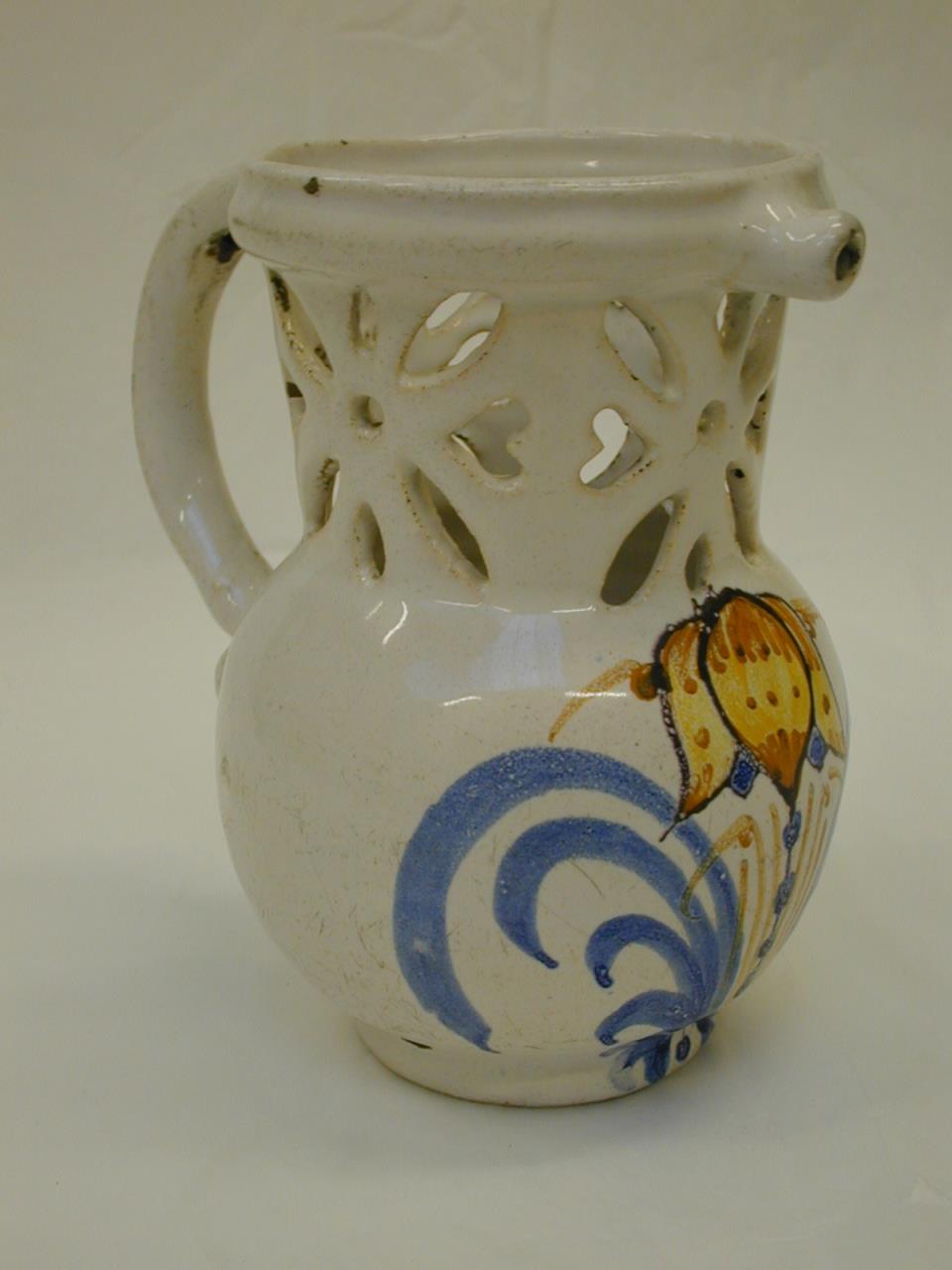 A delftware puzzle jug with one spout. The upper part of the body is decorated with openwork flowers. The front of the jug is decorated with a floral pattern in blue, manganese-purple, yellow and brown.