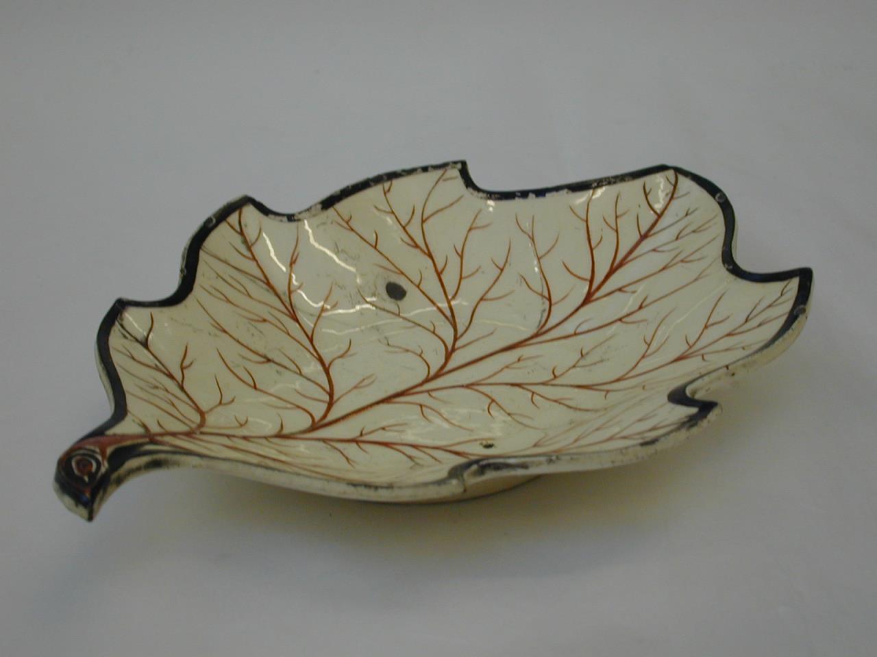 - A Ferrybridge pickle dish in the shape of a leaf. The dish has a black rim with the raised veins of the leaf picked out in red.