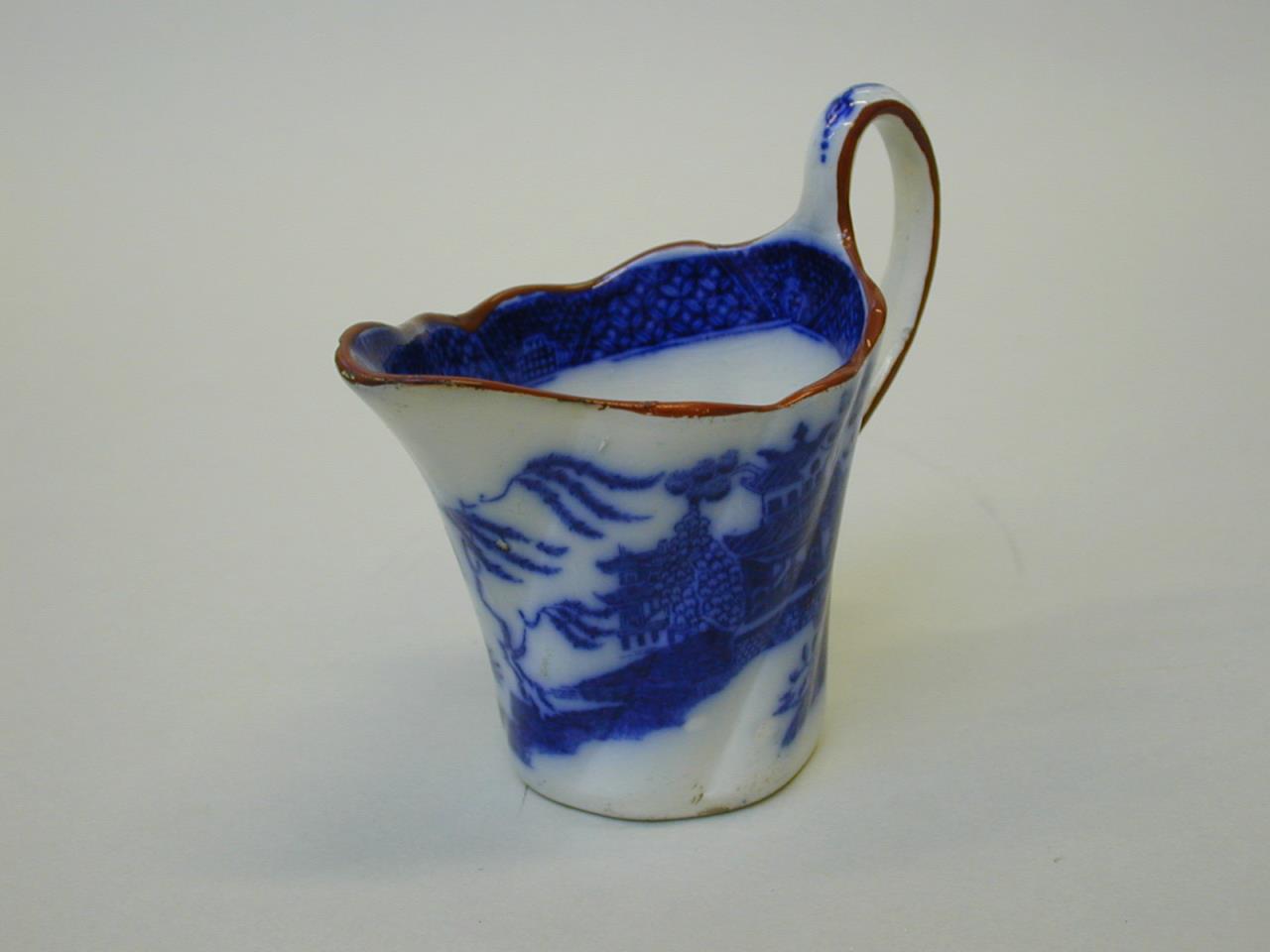- An earthenware cream jug moulded with a spiral reeding decoration. The glaze has a bluish tint. The rim and edges of the handle have a red band. Transfer printed with a blue 'willow pattern'.