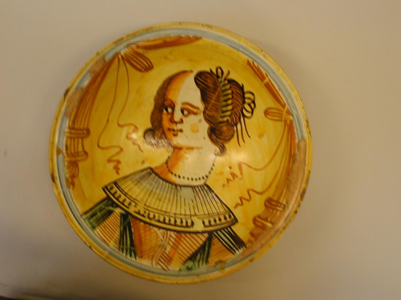 An earthenware bowl decorated with a head and shoulders portrait of a woman. Buff ground with slipware decoration in brown, dark brown, green and pale blue. The underside of the bowl is unglazed.