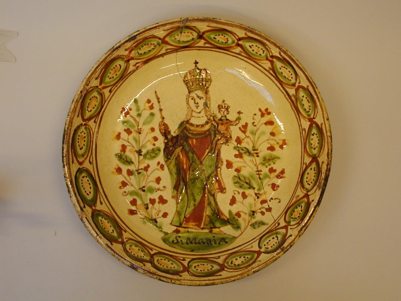 A deep earthenware plate. Pale buff coloured earthenware decorated in medium brown, green and yellow slip with a picture of the Virgin Mary holding the infant Jesus. The underside of the plate is unglazed with the base scored.