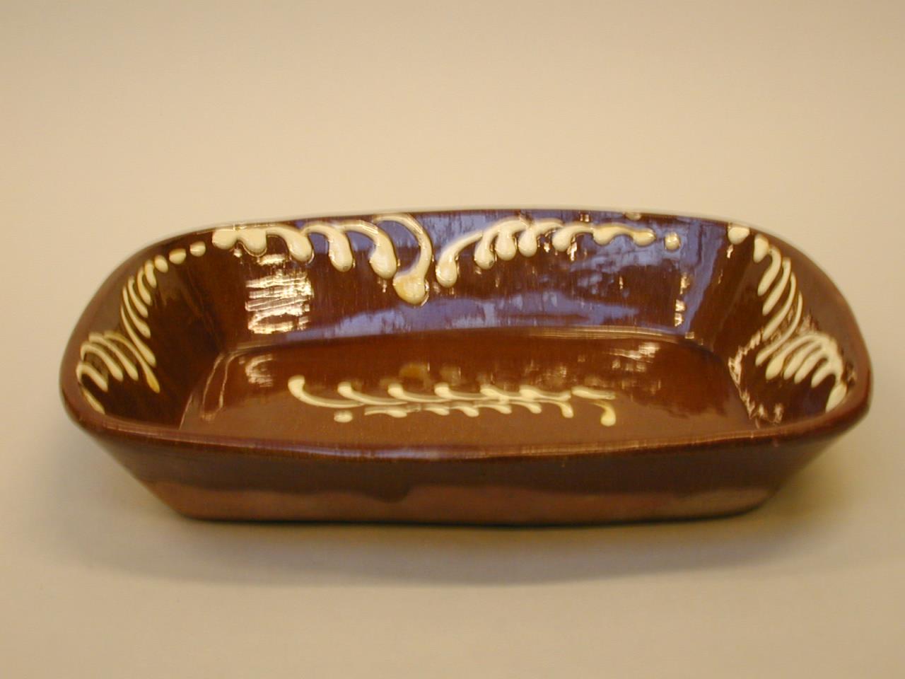 - An oblong dish of red earthenware, with scrolled decoration in a cream coloured slip.The sides and base of the dish are unglazed.