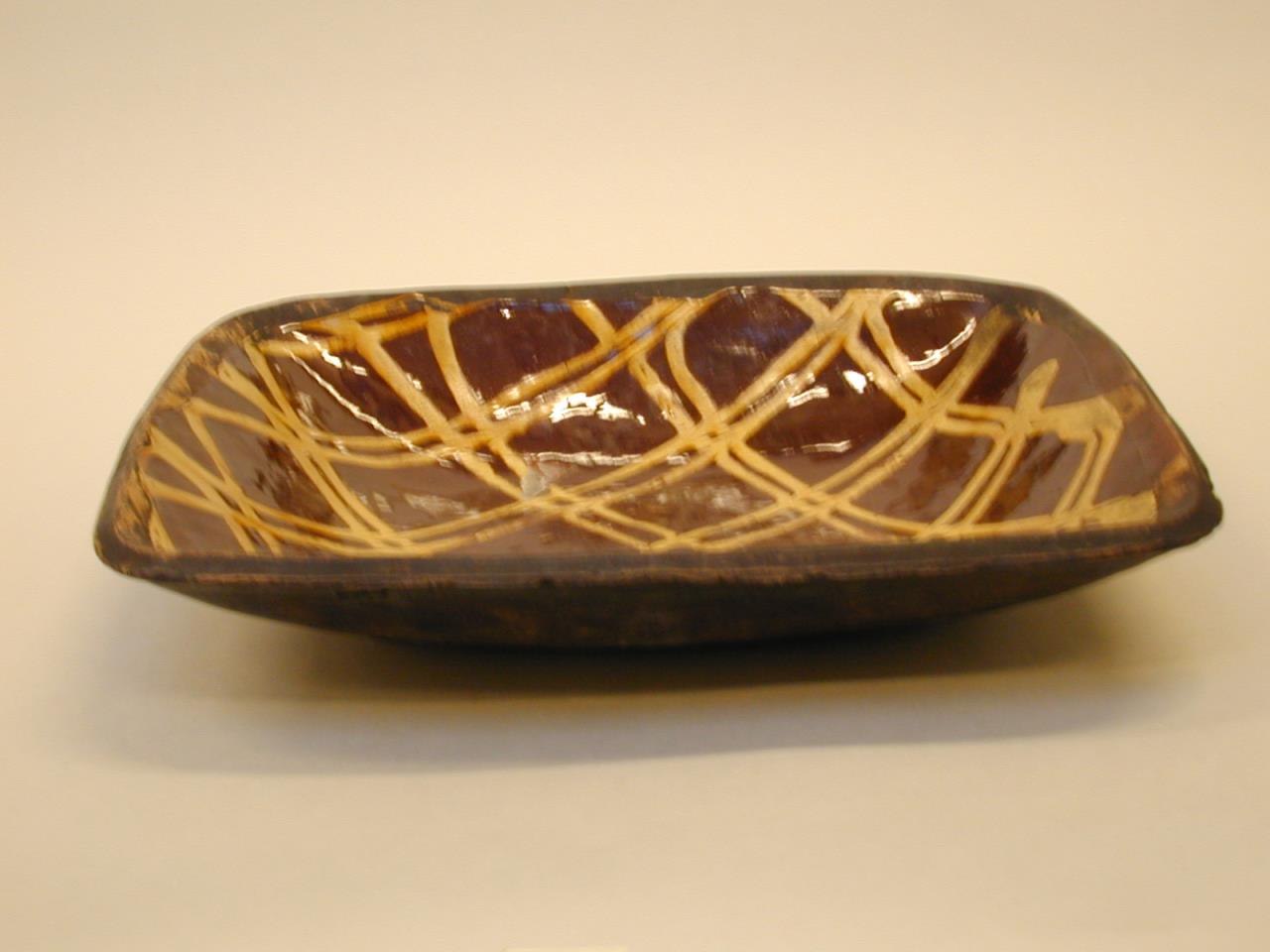 - A rectangular dish of red earthenware, decorated inside with crosshatching in a light coloured slip.The rim, sides and base of the dish are unglazed.