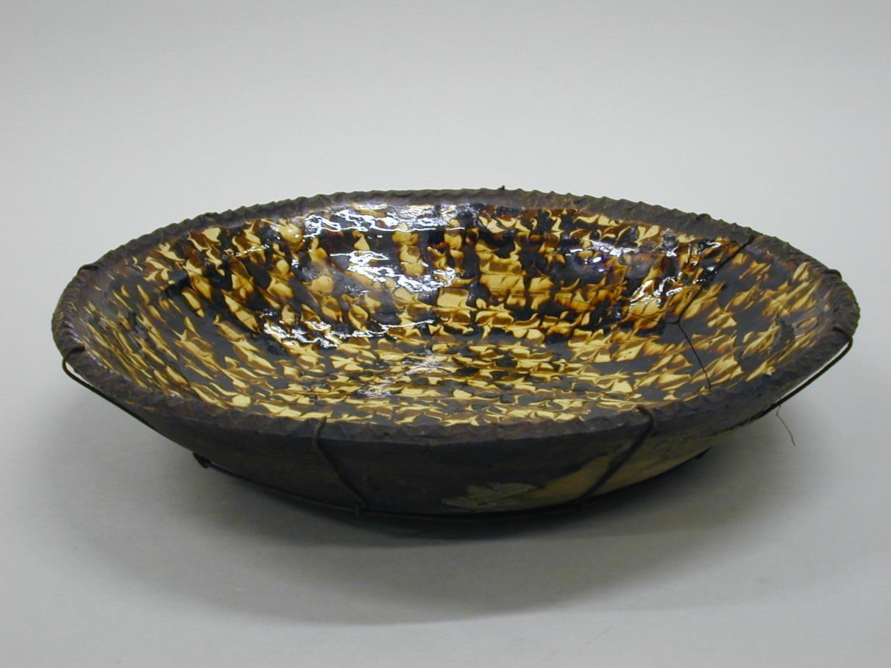 A large round dish of red earthenware with marbled decoration produced from light and dark brown slips. Impressed wavy decoration around the rim.The sides, rim and base are unglazed.